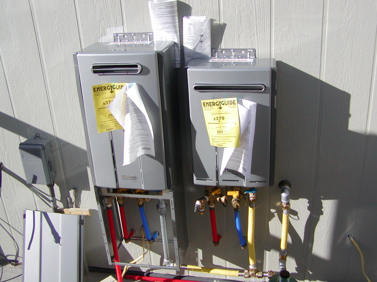 January 5, 2009 -- The two Rinnai water heaters are plumbed for water and propane. The wiring will be done soon. Both will have covers to protect the piping. the one on the left is for the house hot water and the one on the right is for the hydronic heating. |