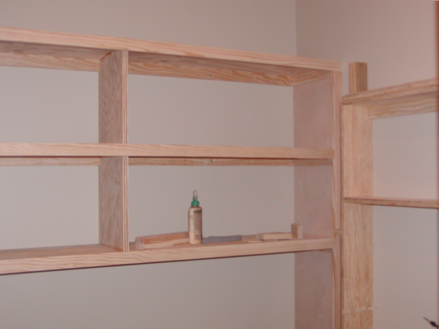 January 5, 2009 -- The office shelves are being finished. A shelf on the right side is not in place because an outlet had to be relocated. The wall will be patched and then the shelf installed. | ![]() |