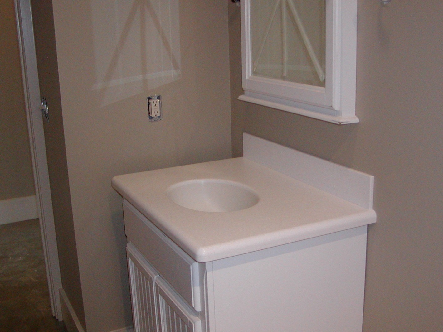 January 6, 2009 -- The counter top and intregal sink are installed in the guest bathroom. The sconce lights that go beside the mirror will be here in a day or two. Notice the reflection of the camera flash on the wall. |