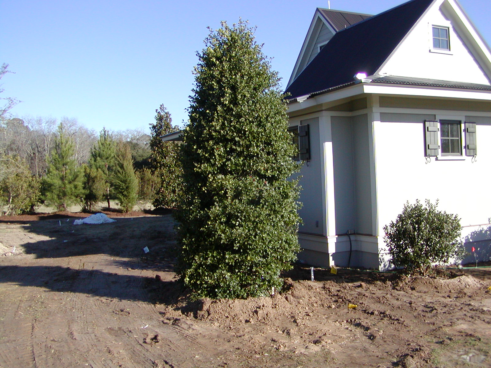 January 9, 2009 -- The north side of the house has trees and shrubs. If you look closely in the "v" of the house, you will see the line that runs to the septic pump and alarm. | ![]() |
