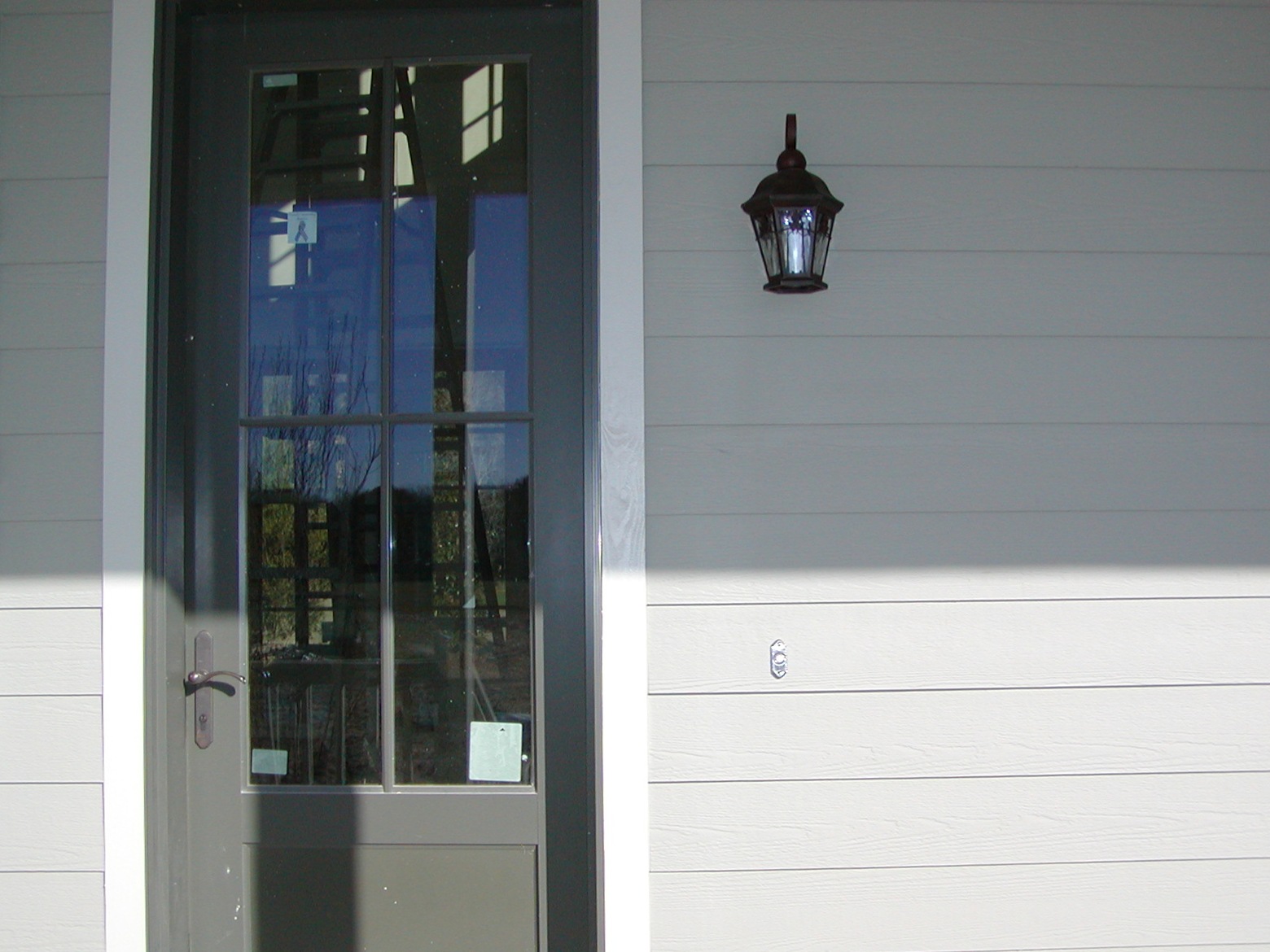 January 9, 2009 -- The front door light is installed. An oil rubbed bronze door bell switch has also been installed. The color of the door bell button is washed out because of the bright sunlight. | ![]() |