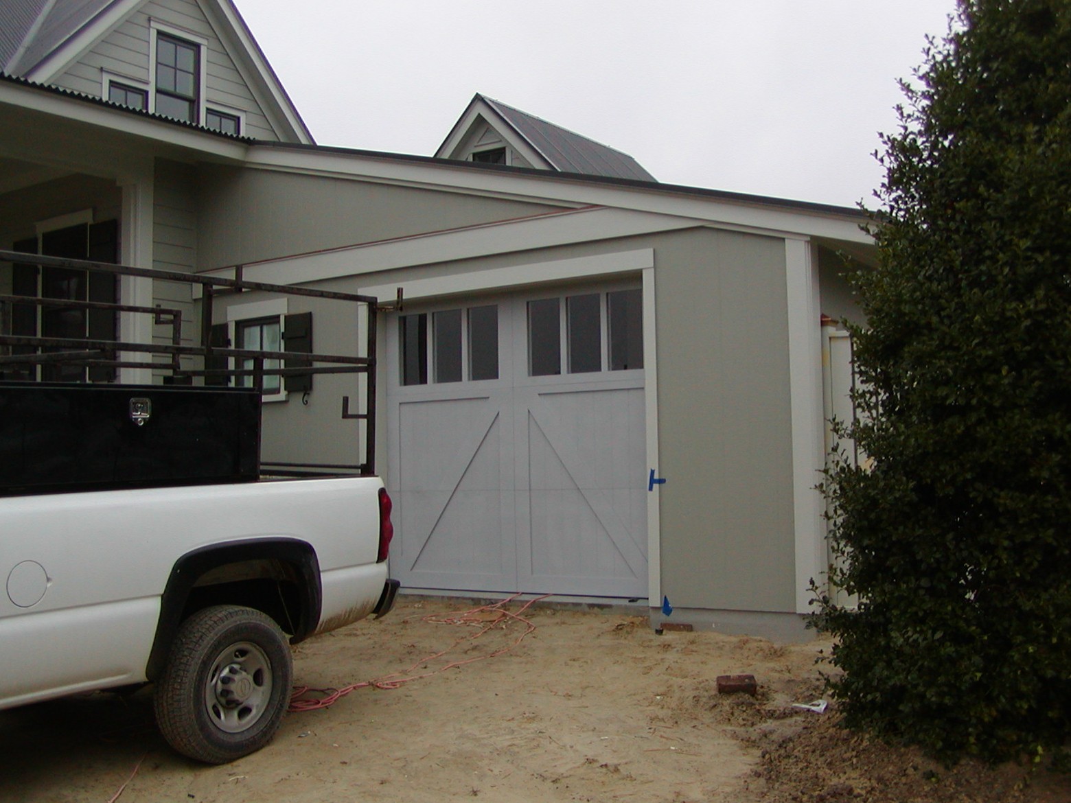 January 13, 2009 -- The main garage door is being installed. Before the day is over, both doors should be operational. The door is primed and will be painted in a few days. | ![]() |