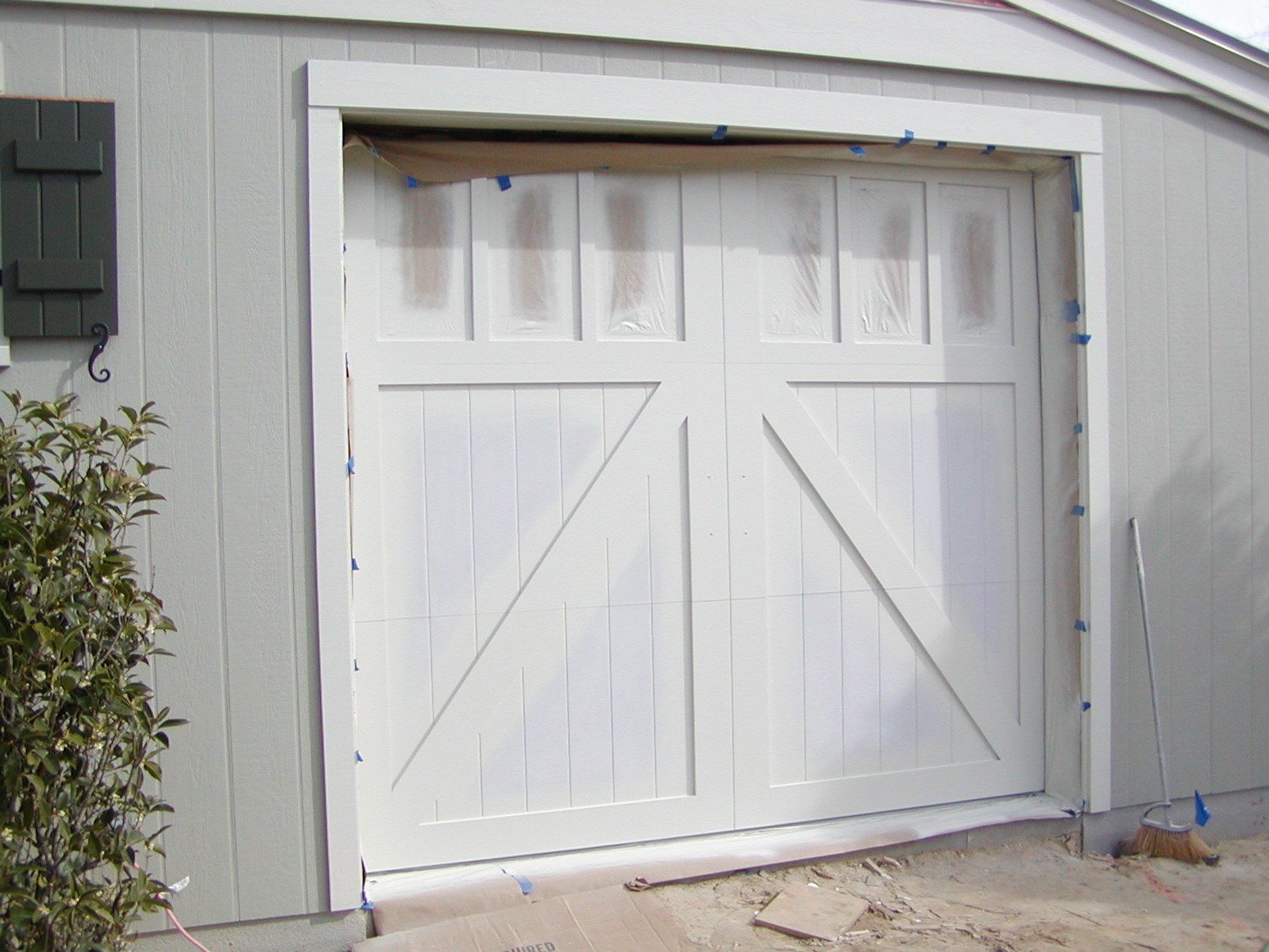 January 15, 2009 -- The garage doors are installed and being painted. The "trim" boards of the doors are being painted the trim color. The background panels will be painted the siding color. | ![]() |