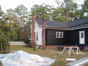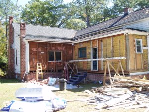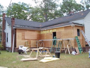 Plywood sheathing is installed. Only one section of the home at a time is remodeled.