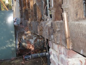 The right side of the house is stripped and checked. New insulation, sheathing and siding will be installed.