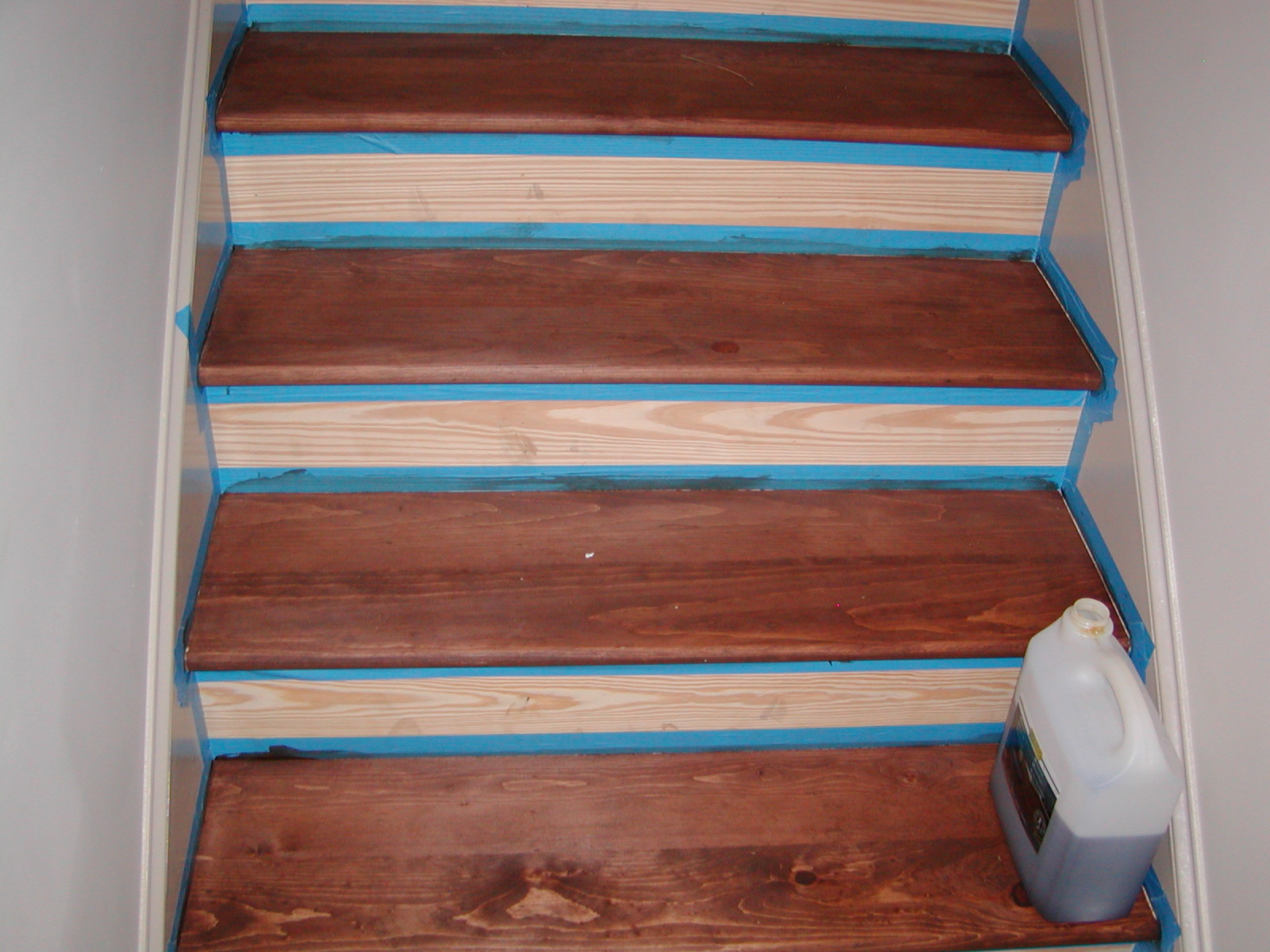 September 26, 2007 -- The garage steps have been stained. The risers (vertical parts) are to be painted as are the aprons (along the walls). The blue is masking tape. | ![]() |