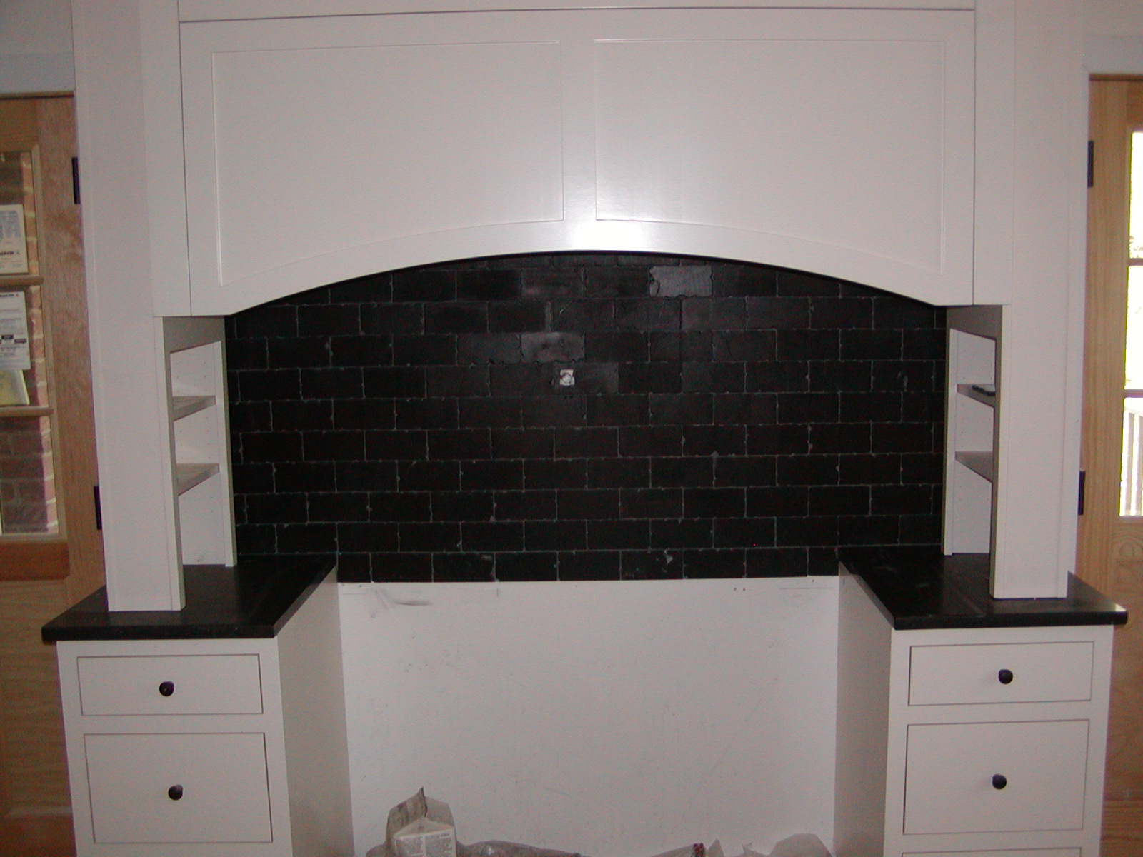 November 2, 2007 -- The tile back splash is finished. It will be grouted in the next few days. The white spot in the middle is for a pot filler. | ![]() |