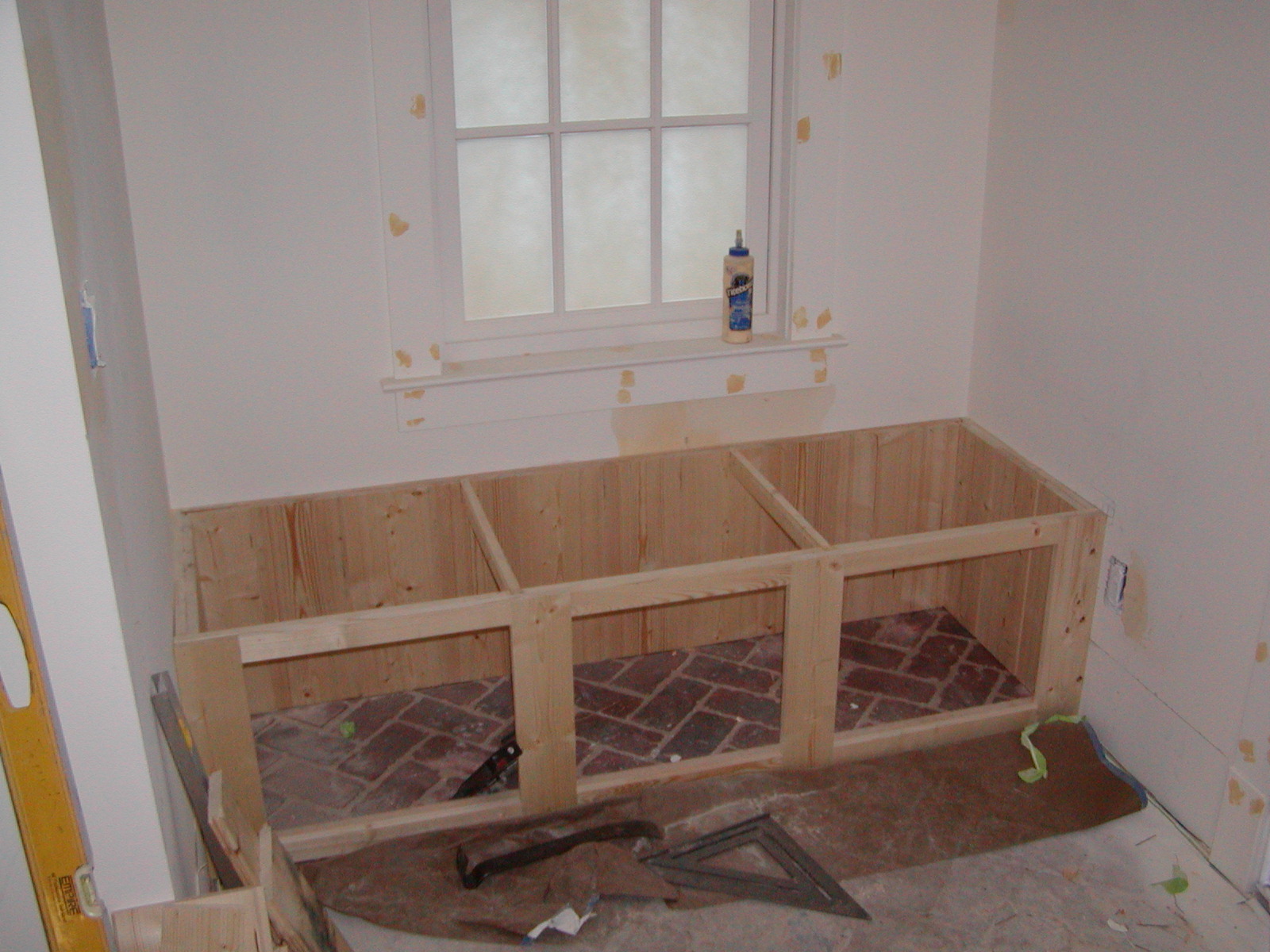 November 28, 2007 -- A window seat is being built in the mud room. The window seat will be stained. The spots on the window casing are putty filling nail holes. It will be sanded and painted. | ![]() |