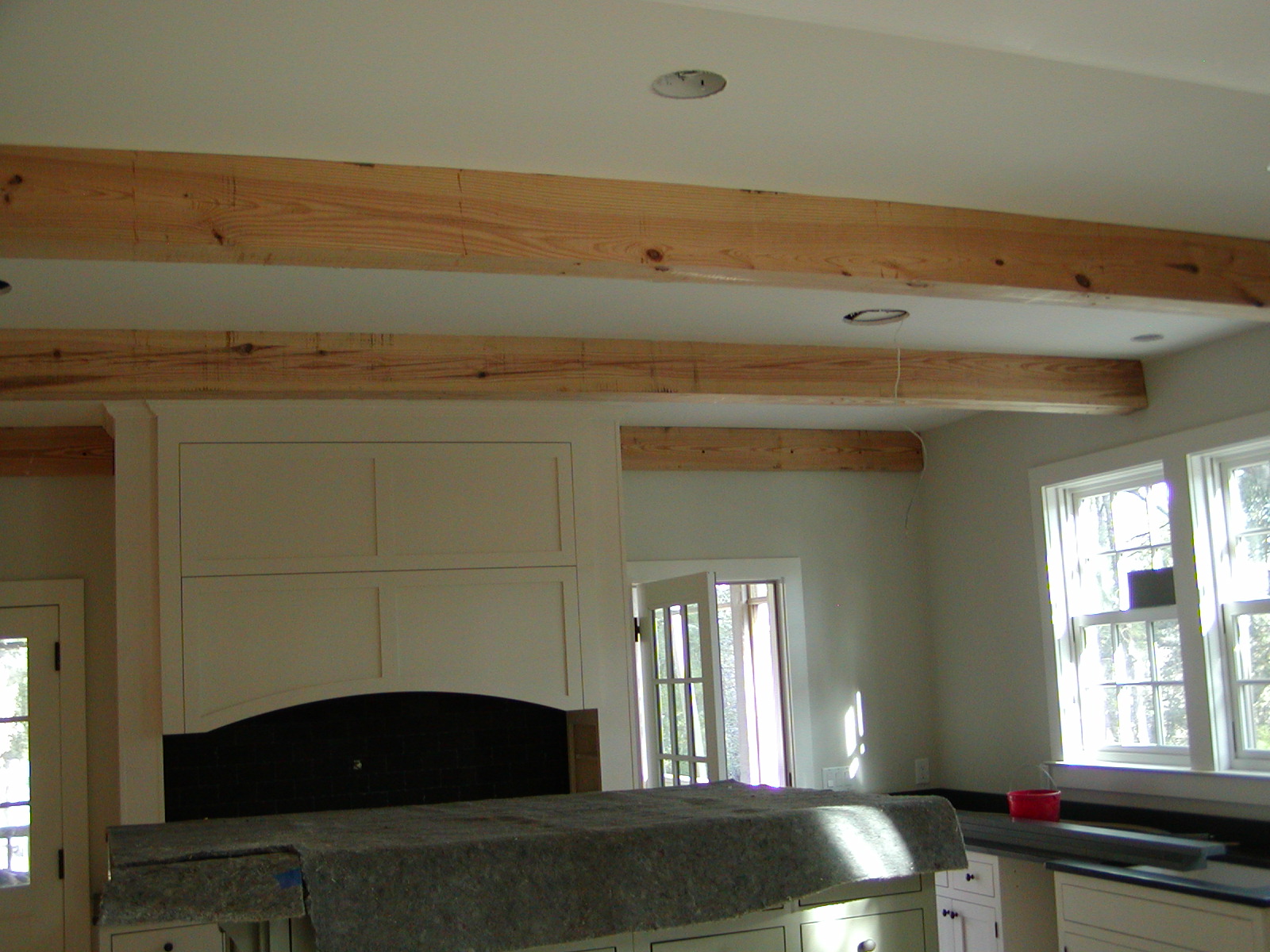 January 10, 2008 -- The kitchen now has beams on the ceiling. They will be finished with crackle paint to simulate the look of old beams. There is also a beam on the close wall that is out of the camera range. |