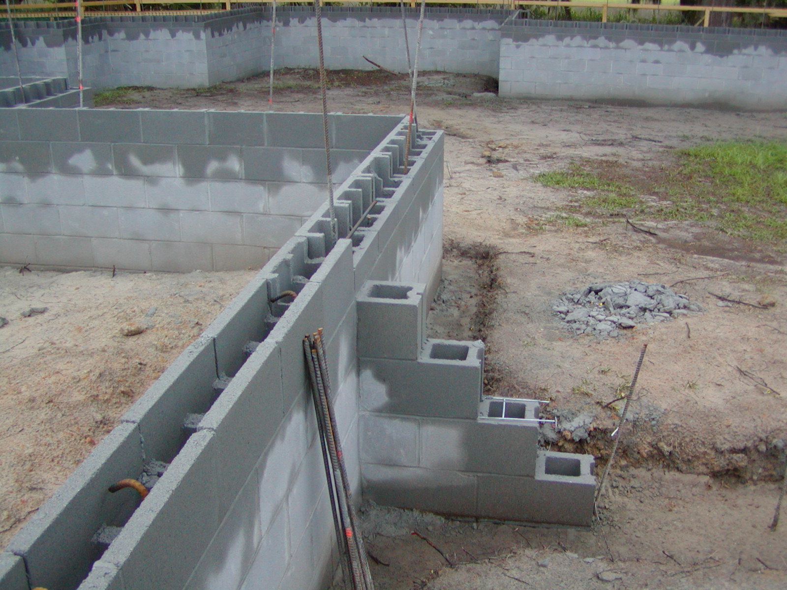 July 11, 2008 -- This shows the two kinds of top blocks used. The close ones are header blocks, they will be poured and this will form a solid concrete beam. The garage will be built on this beam. The house slab will be poured against the ledger block that has a lip on one side. |