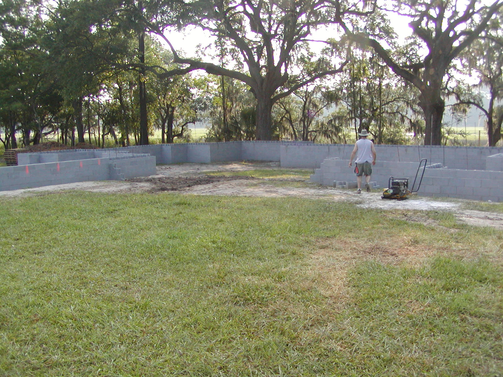 July 14, 2008 -- The batter boards are down and the footers in the front are covered. Dirt will be brought in this way to fill the walls of the foundation. A small plate packer is on the right edge of the photo. |