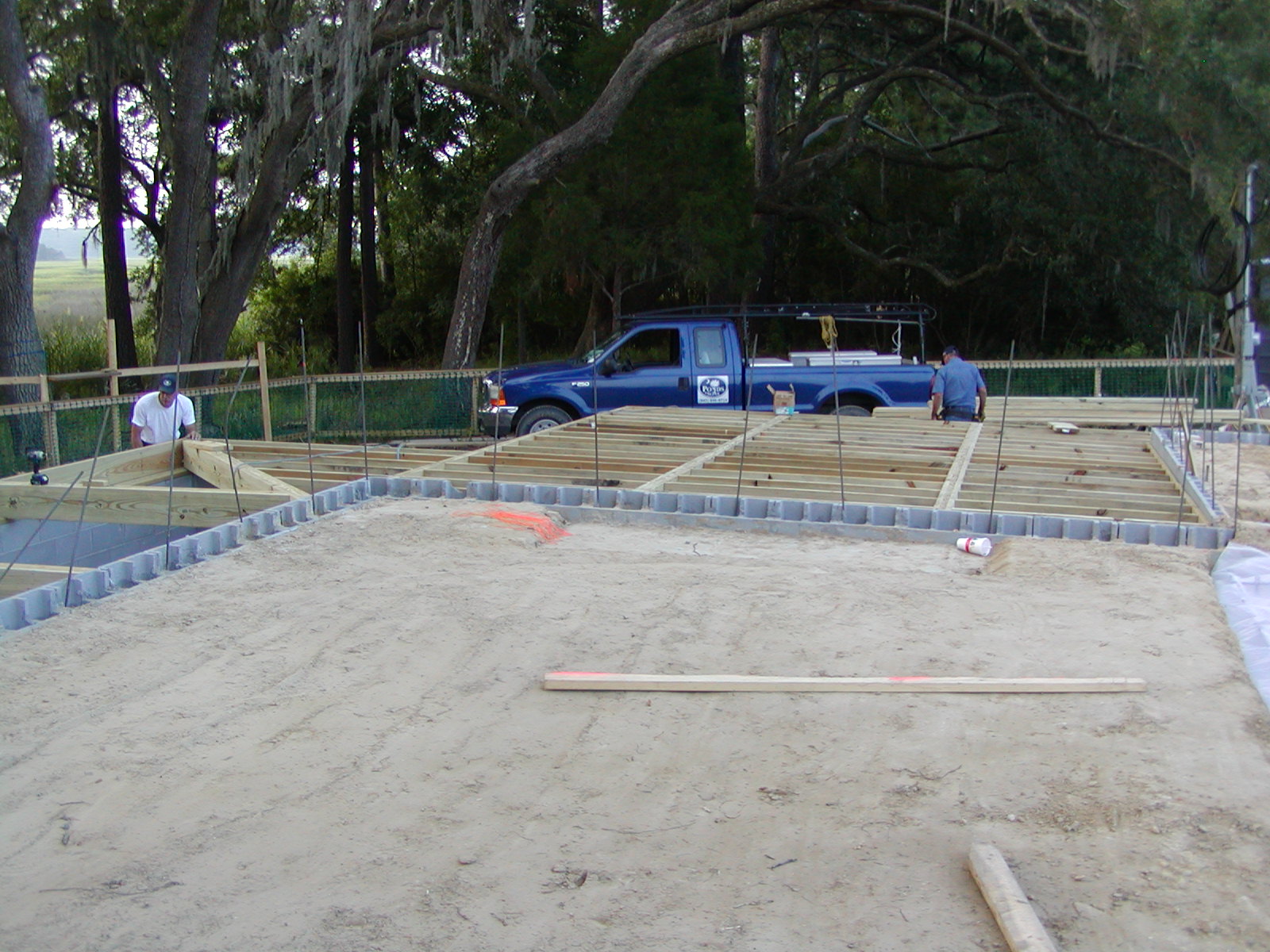 July 23, 2008 -- Porch framing continues. The porch to the right (behind the chimney foundation) will be screened. | ![]() |