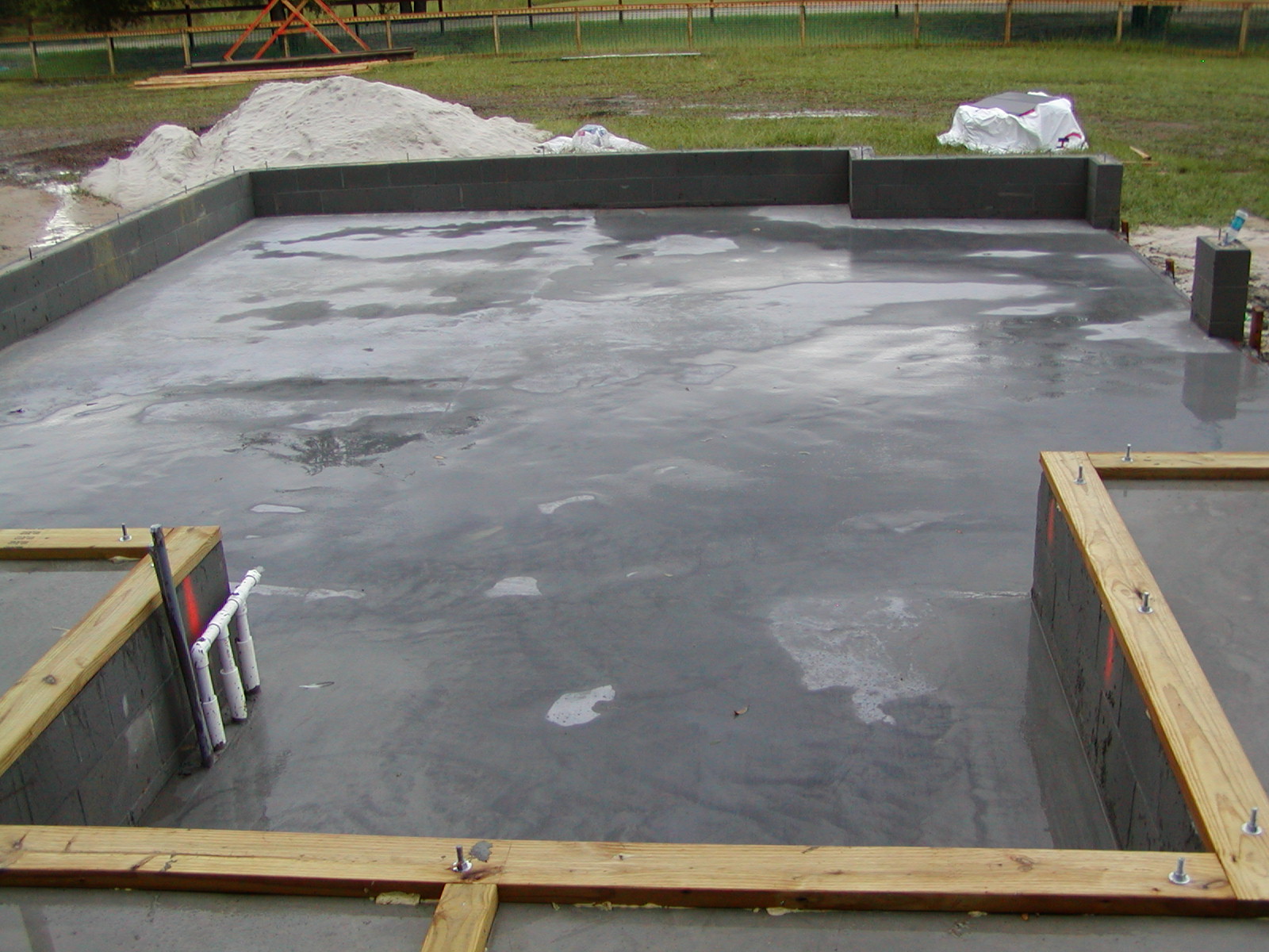 July 29, 2008 -- The garage floor is poured and we have had a rain shower. The white pipes are for water from the well. | ![]() |