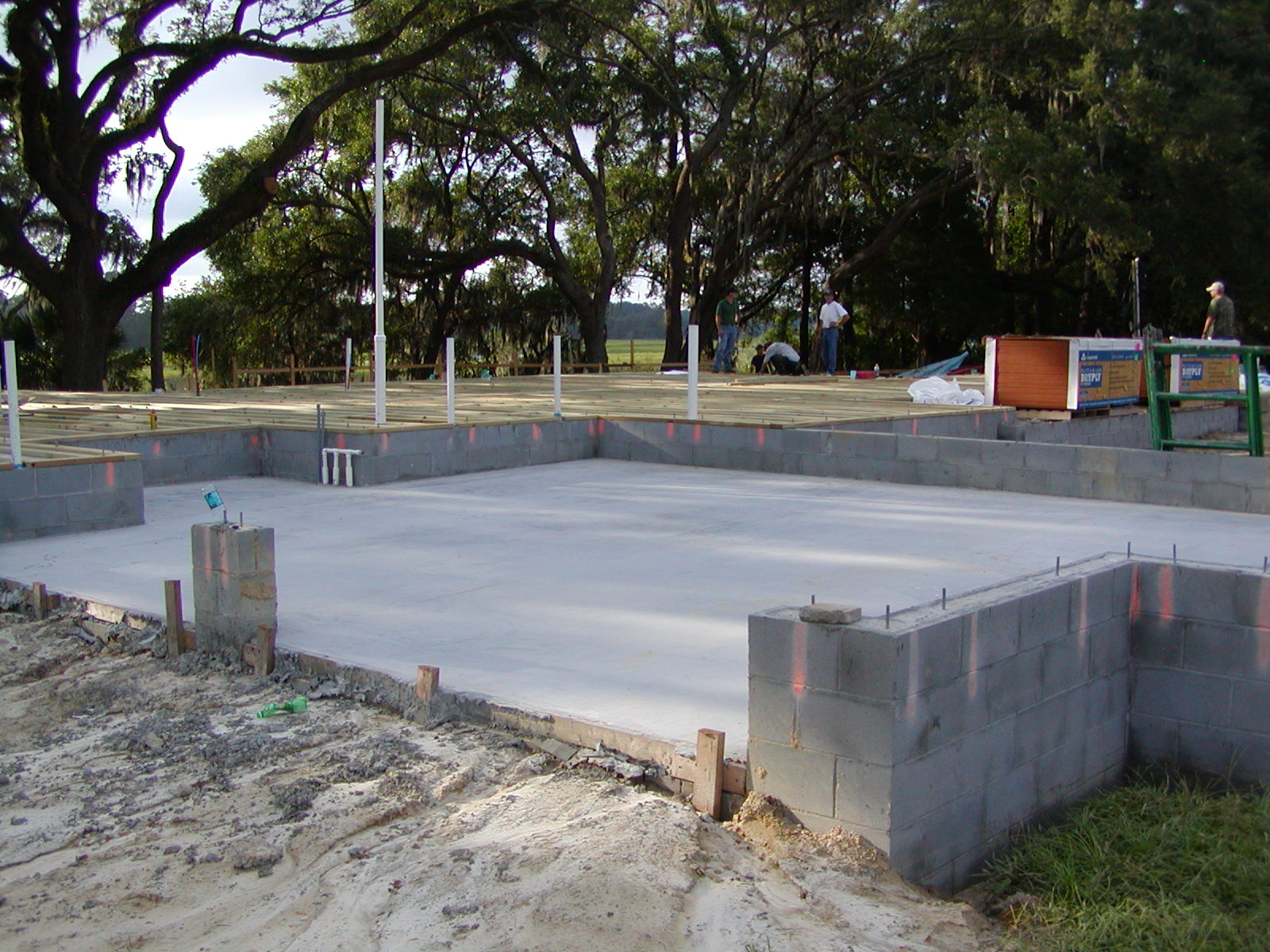July 31, 2008 -- This is the house and garage from the north west corner. The plywood for the subfloor is sitting on the sleepers shown on the right. | ![]() |