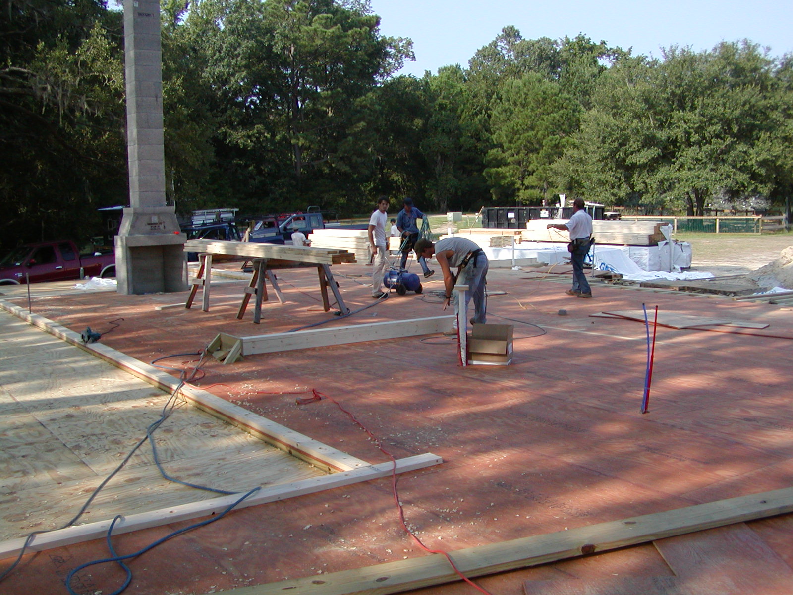 August 5, 2008 -- The plywood subfloor is being installed. The deck (on the left) is covered with plywood to protect the decking material during the construction process. | ![]() |