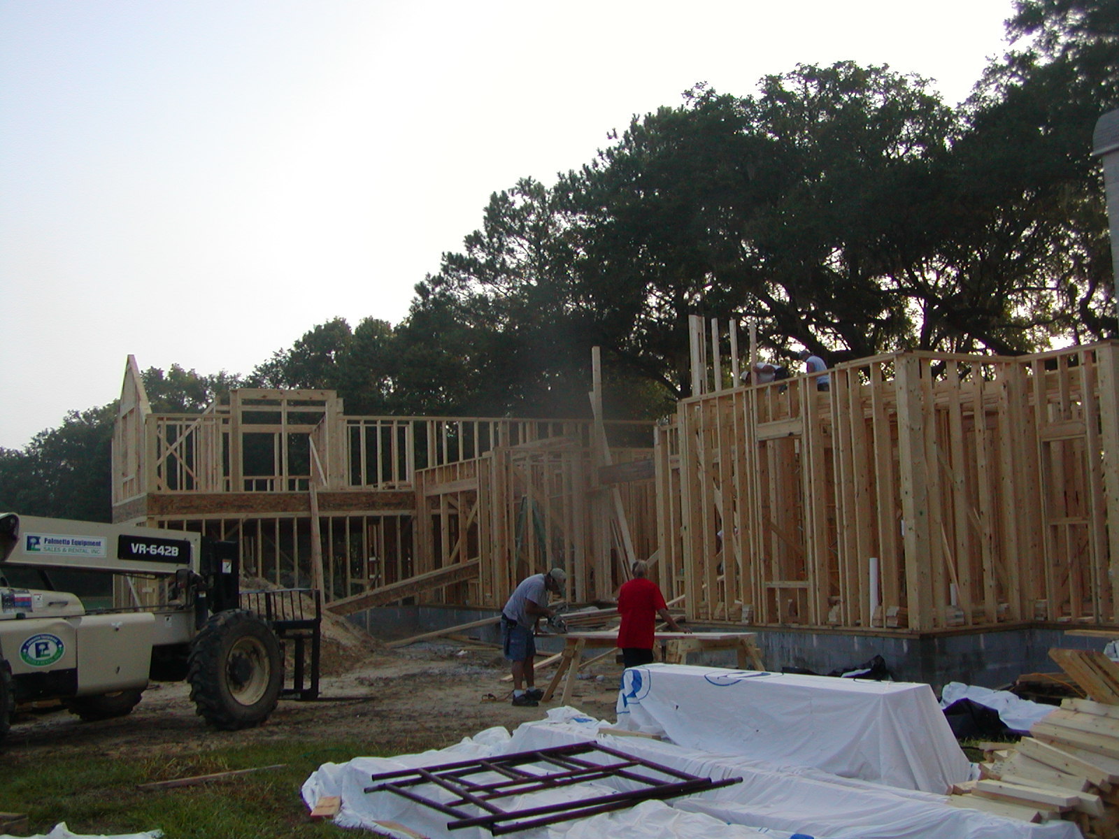 August 19, 2008 -- From the southwest, Mary's studio is easily seen. The break in the wall just above the red shirt is where the entrance foyer will be. | ![]() |