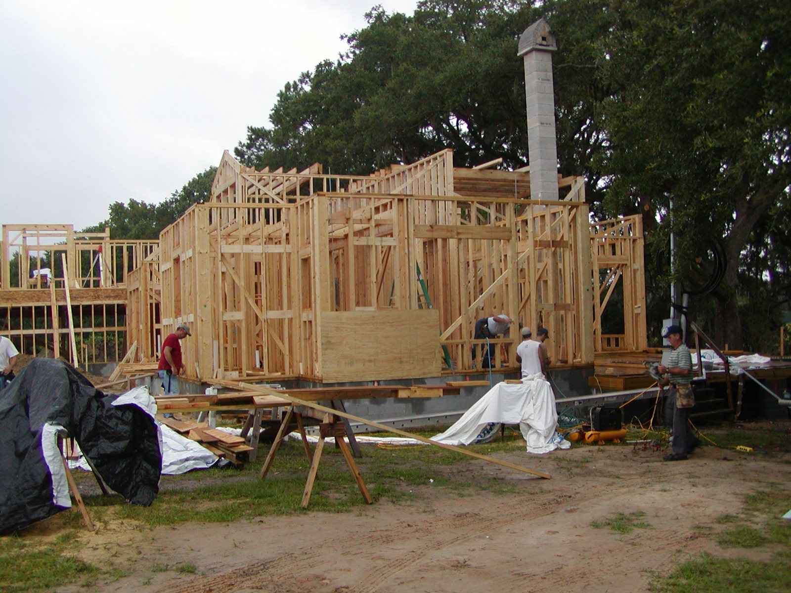 August 21, 2008 -- Plywood is going up on the walls. Today the chance of rain is 70%, so it unclear how much work will get done. So far (9 am), we have had one rain shower. | ![]() |