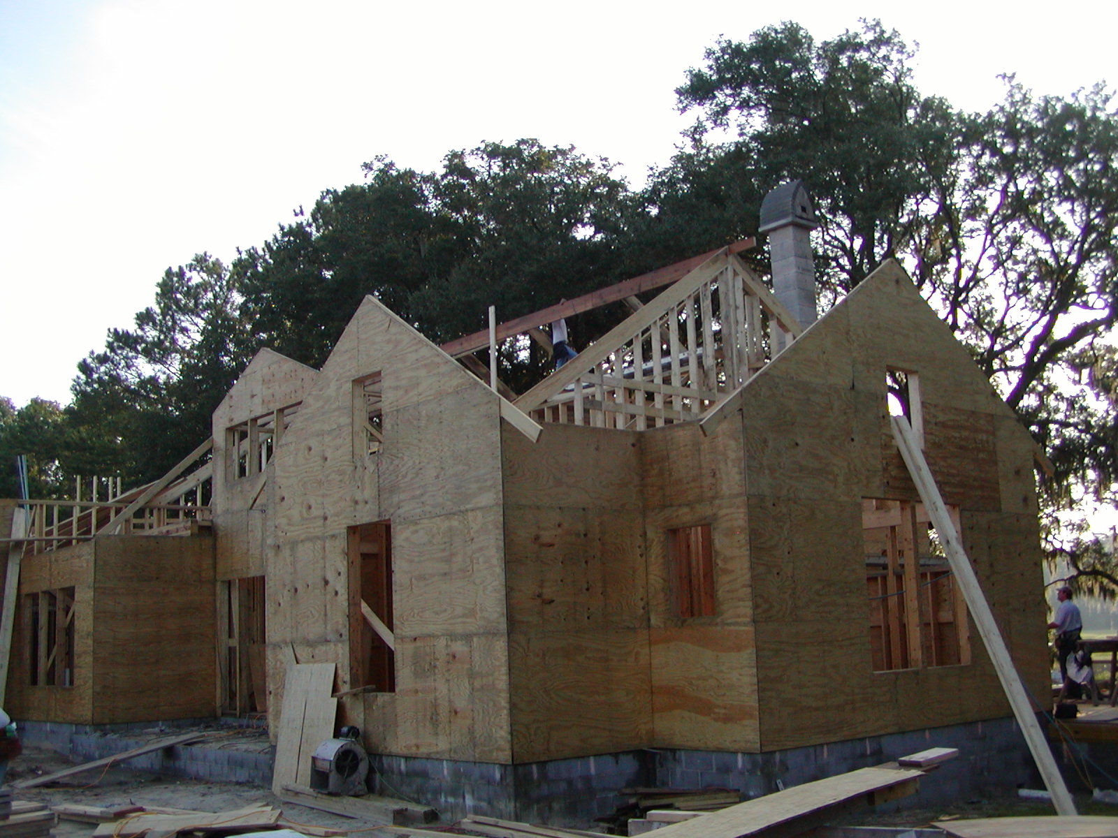 August 27, 2008 -- The main ridge beam is up. Rafters are being installed. More plywood sheathing was also done yesterday. Rain keeps cutting into the workdays. | ![]() |