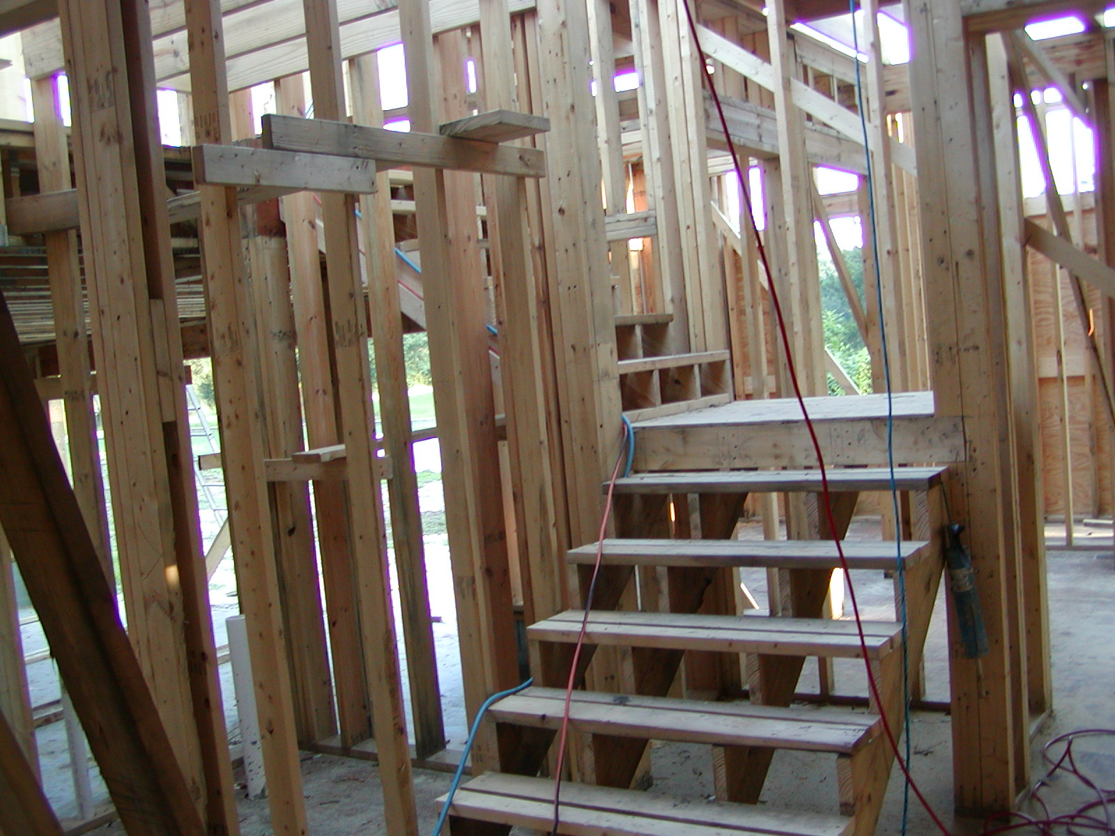 August 29, 2008 -- The stairs to Mary's studio are roughed in. This is the only living space on the second floor. There are several storage areas in addition to the studio. | ![]() |
