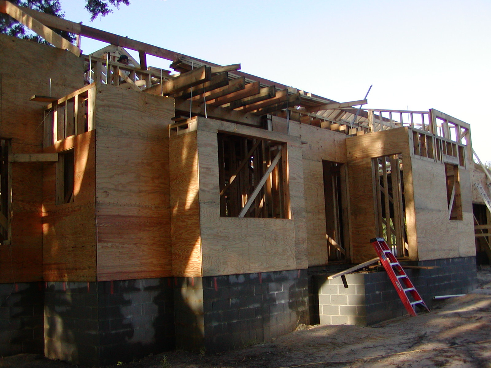 September 2, 2008 -- The master suite on the north end is sheathed. The ladder is leaning up where the owner's entrance porch will be built. | ![]() |