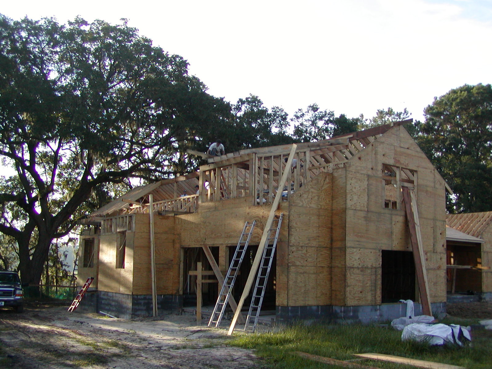 September 3, 2008 -- Rafters are being installed over the master suite and Mary's studio. This is the last area for rafters. | ![]() |