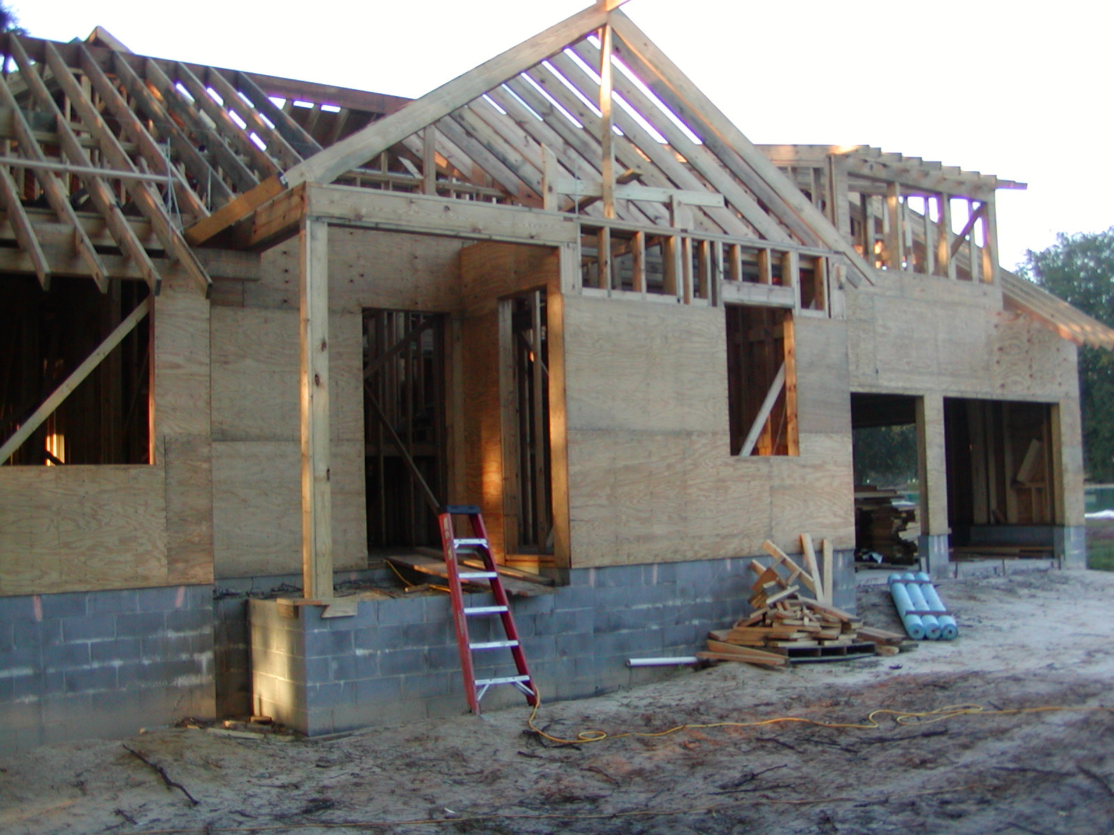 September 9, 2008 -- The great room dormers look towards the east. A porch roof will be built over the rear deck. The steel rods for tie down purposes are being installed. | ![]() |