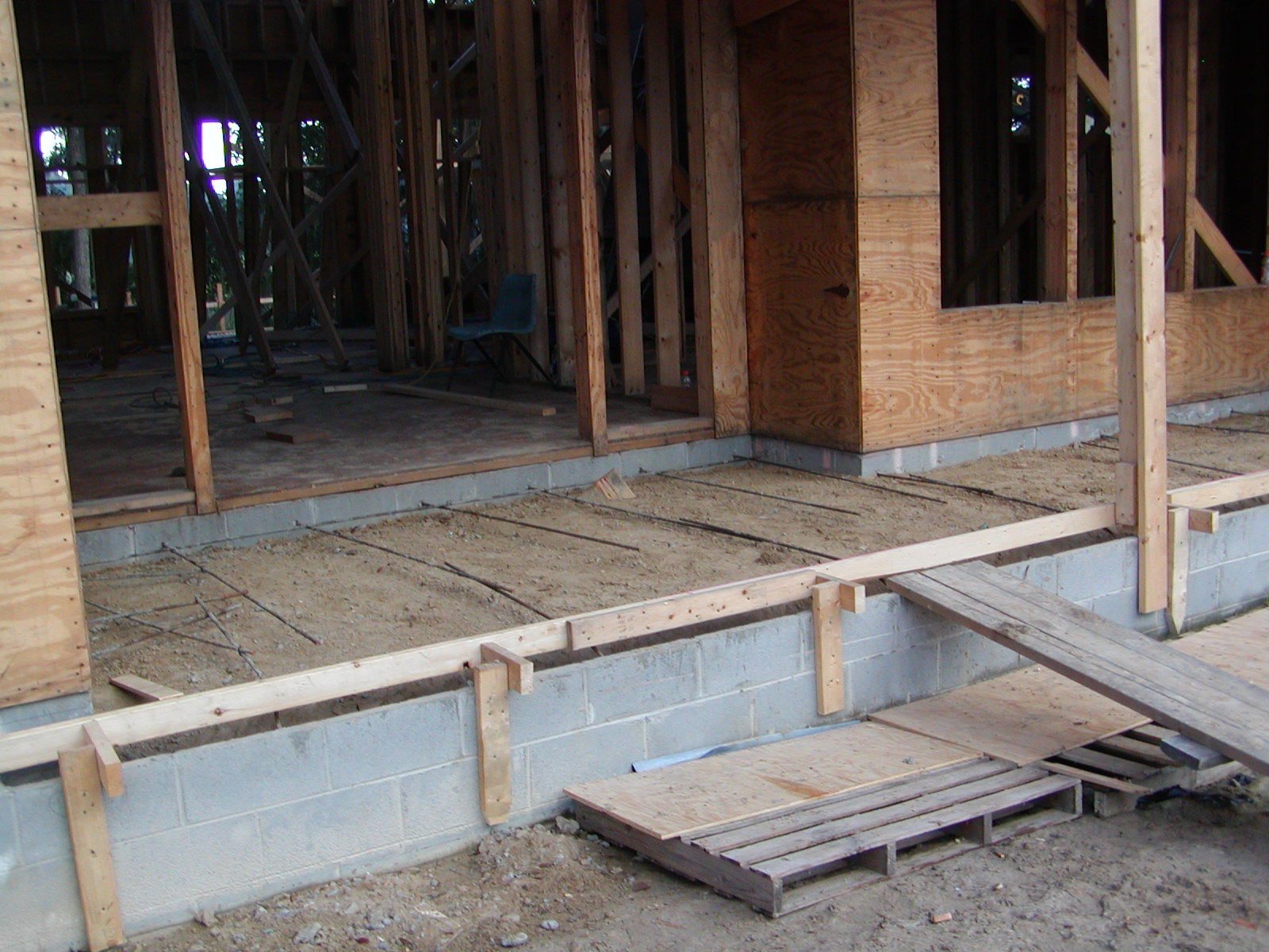 September 10, 2008 -- The front porch (and owner's entry porch) are formed and ready for pouring. The chance of rain is 70% today and tomorrow, so it remains to be seen when they will actually be poured. Both have a brick border on the outside edge. |