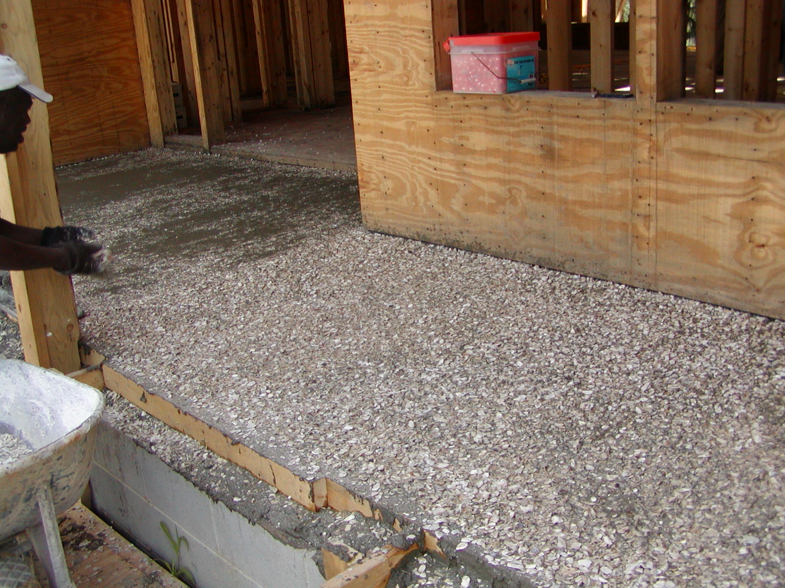 September 10, 2008 -- The front porch has been poured and now shell is being embedded in it. There is a ledge on the front (lower left) for a row of bricks. | ![]() |