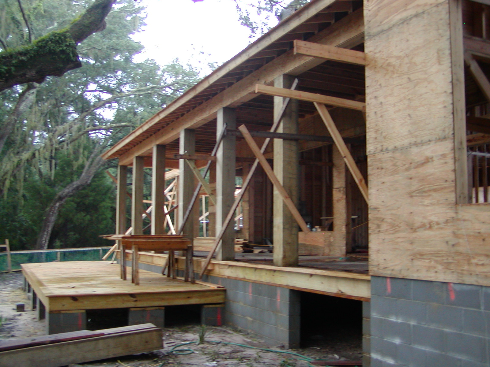 September 12, 2008 -- The east side of the rear porch is framed and roofed. There will be steps from the upper porch to the lower deck. Part of the upper porch is screened and part is not. | ![]() |