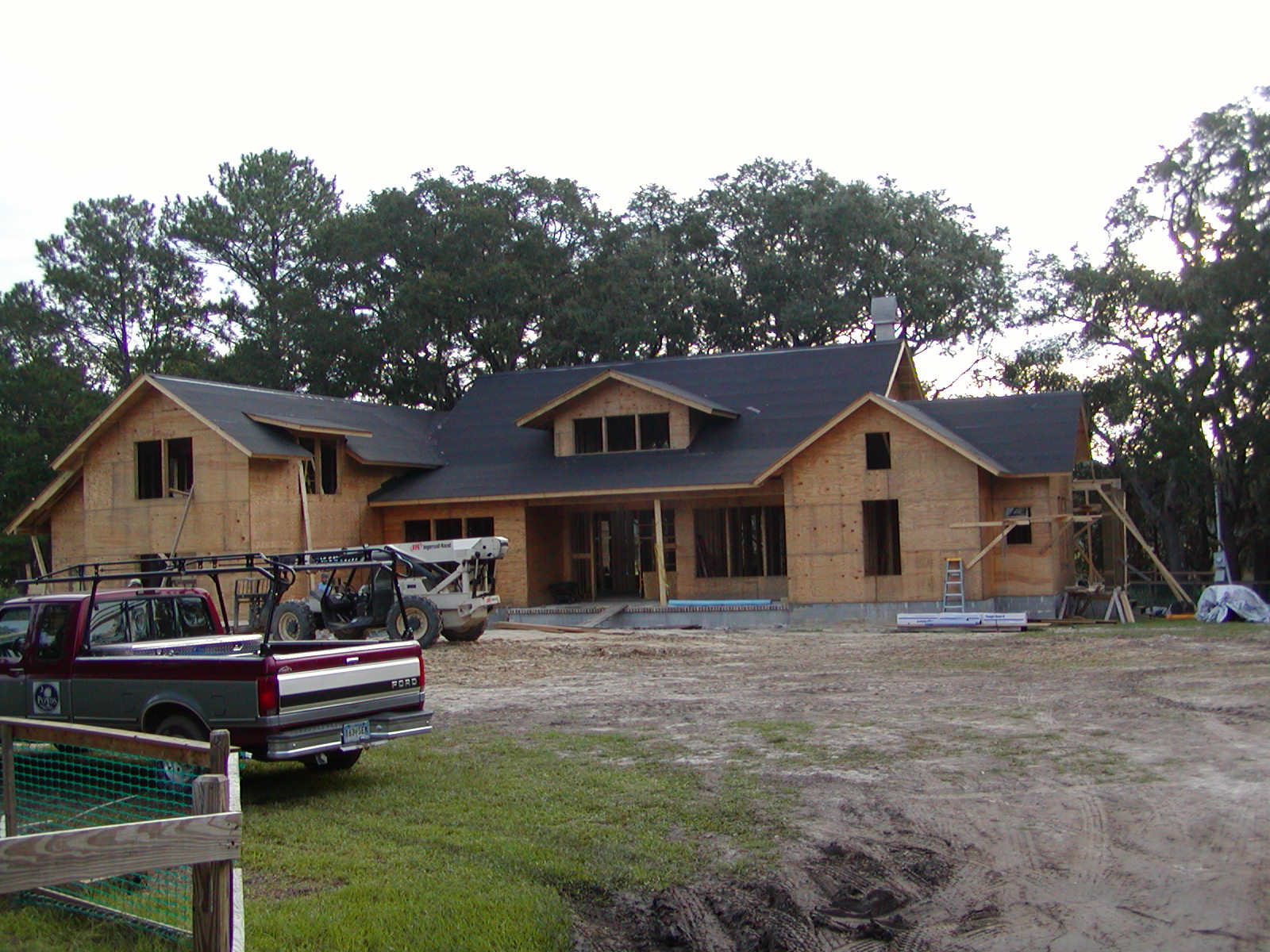 September 18, 2008 -- From the driveway, the house is taking shape. The roofs are covered. They are pretty much complete except for the public screened porch. It will be done shortly. | ![]() |