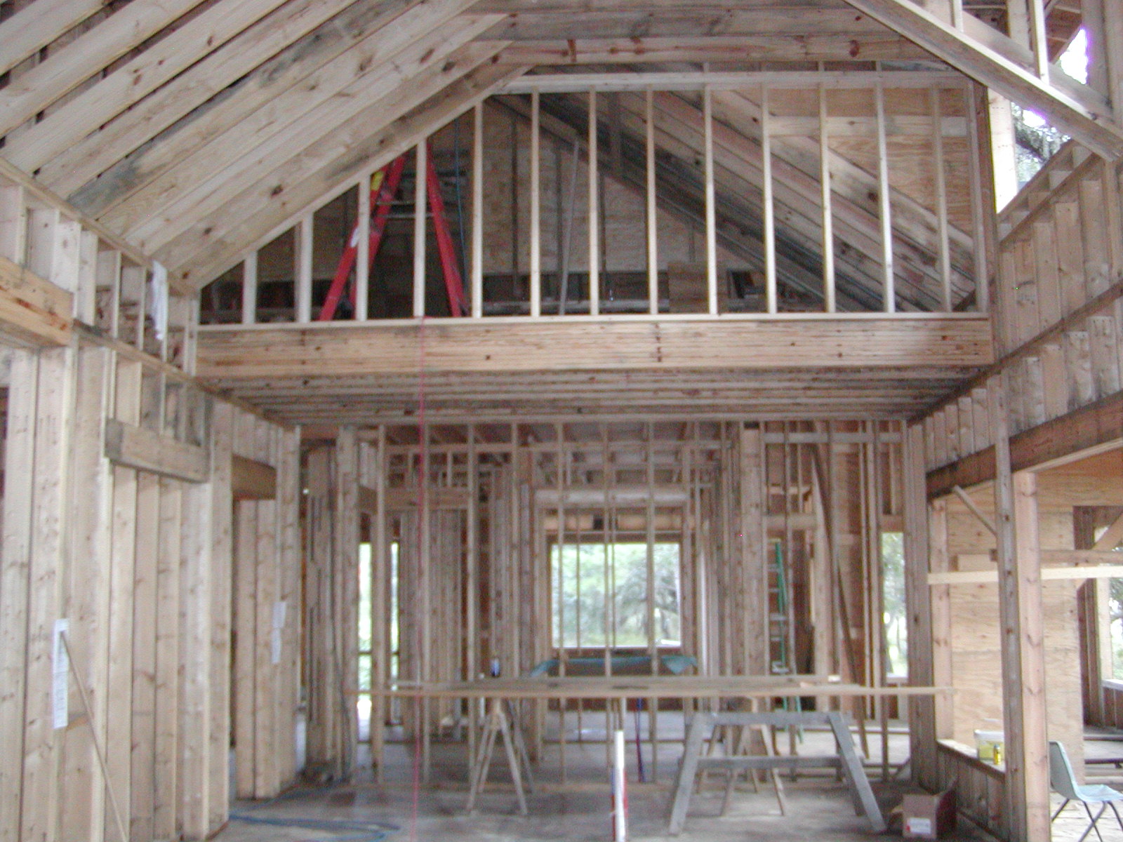 September 18, 2008 -- Framing is being finished in the great room. The wall over the kitchen (at the far end) is now framed. | ![]() |