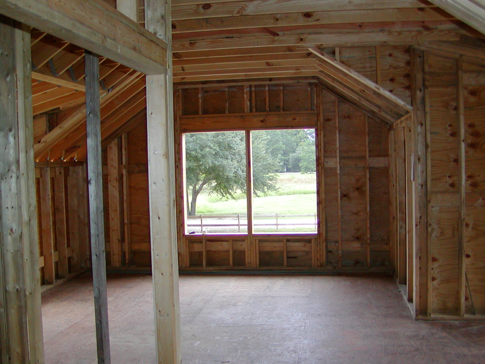 September 19, 2008 -- This is Mary's studio. The studs on the left are for a closet. The board fence along the road is visible through the windows. | ![]() |