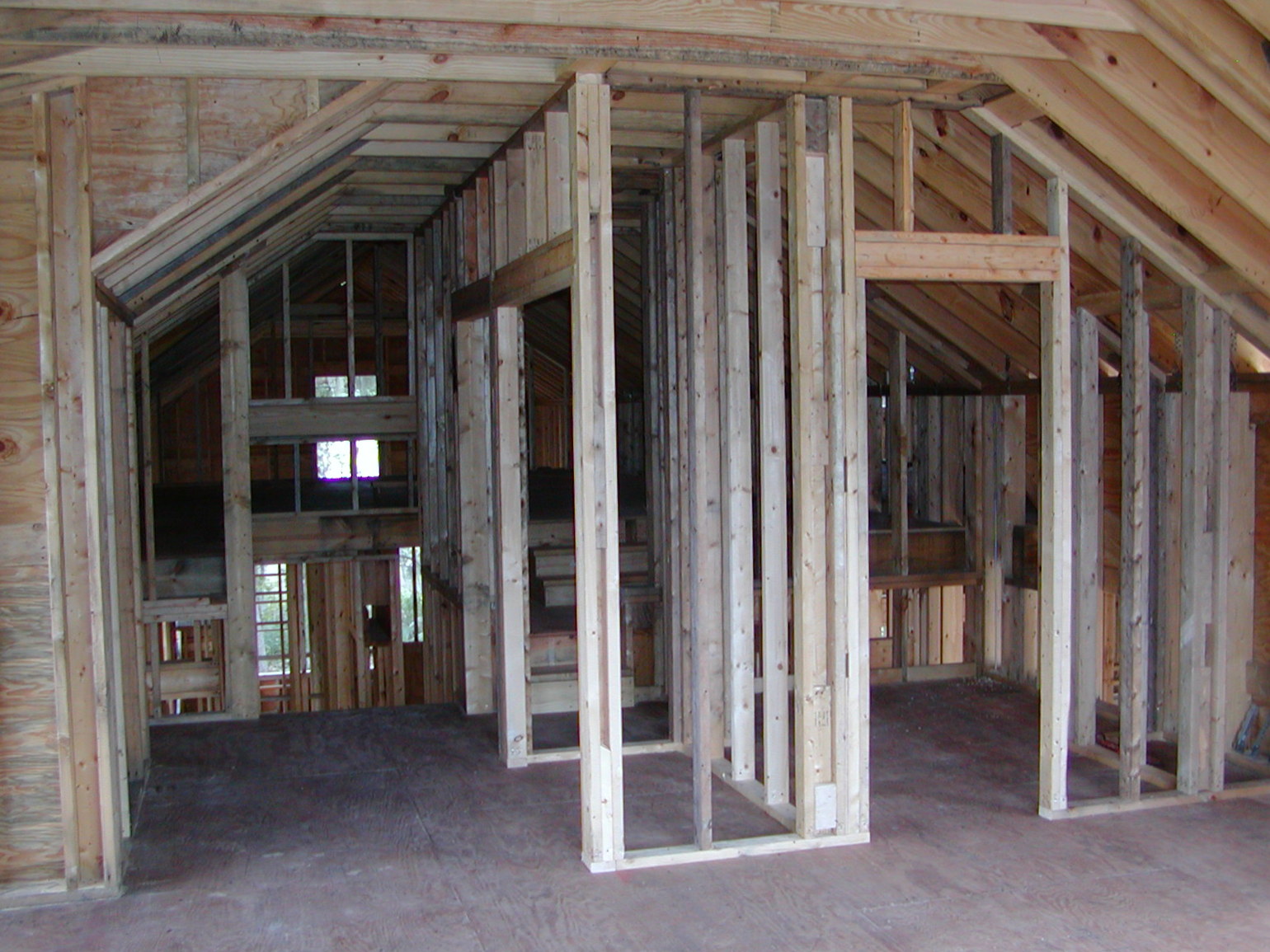 September 19, 2008 -- This is looking east in Mary's studio. The steps that are staggered go up to the attic storage areas. Just to the left of them are the steps down. The room on the right is where a future bath could be installed. |