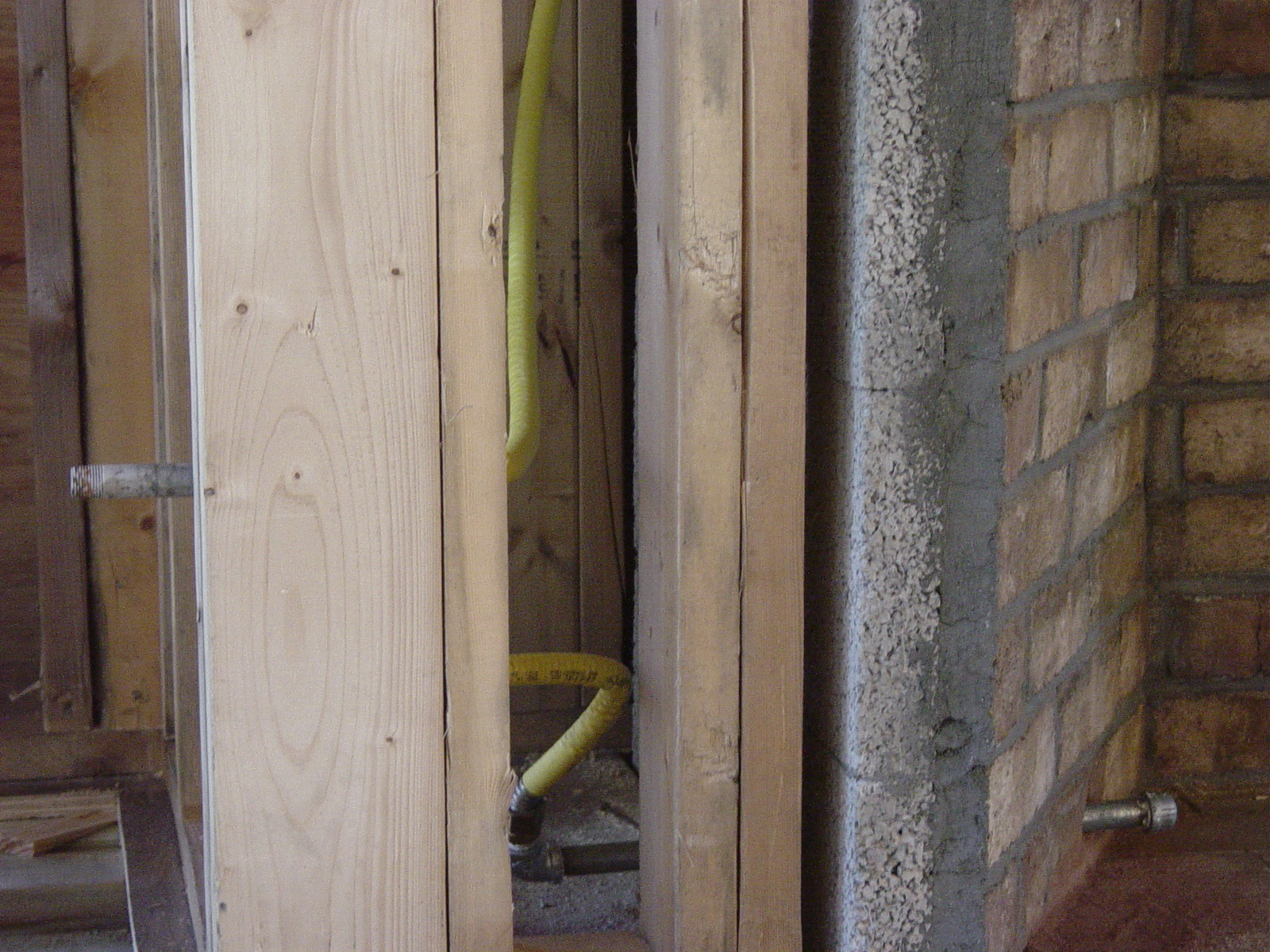 October 6, 2008 -- Propane gas piping was installed today. Here is the piping to the fireplace with the outlet on the right and the valve on the left. | ![]() |
