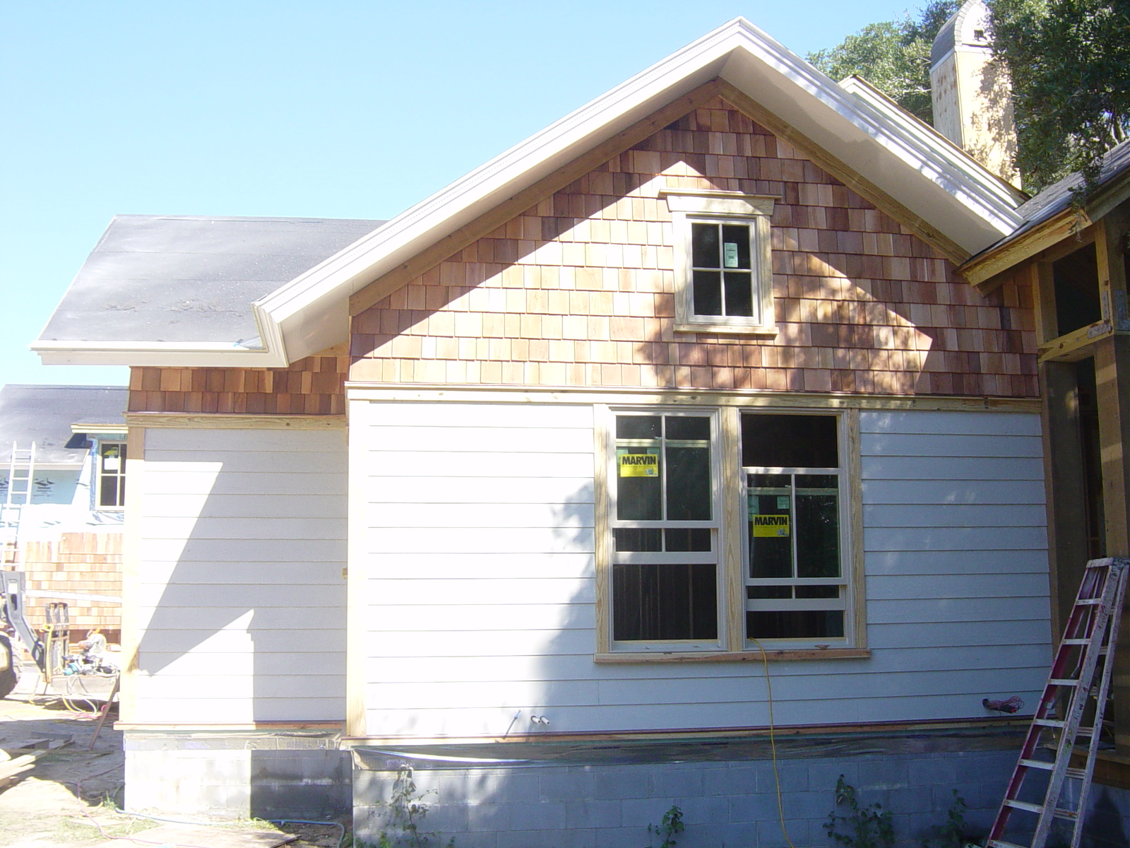 October 14, 2008 -- The siding is coming along nicely. Another gable was completed today. This is the gable over bedroom 3. | ![]() |