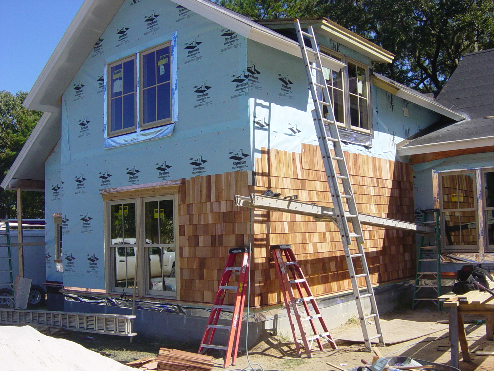 October 14, 2008 -- The siding is making its way around the garage. The double window is trimmed now as is the wall drip along the bottom. | ![]() |