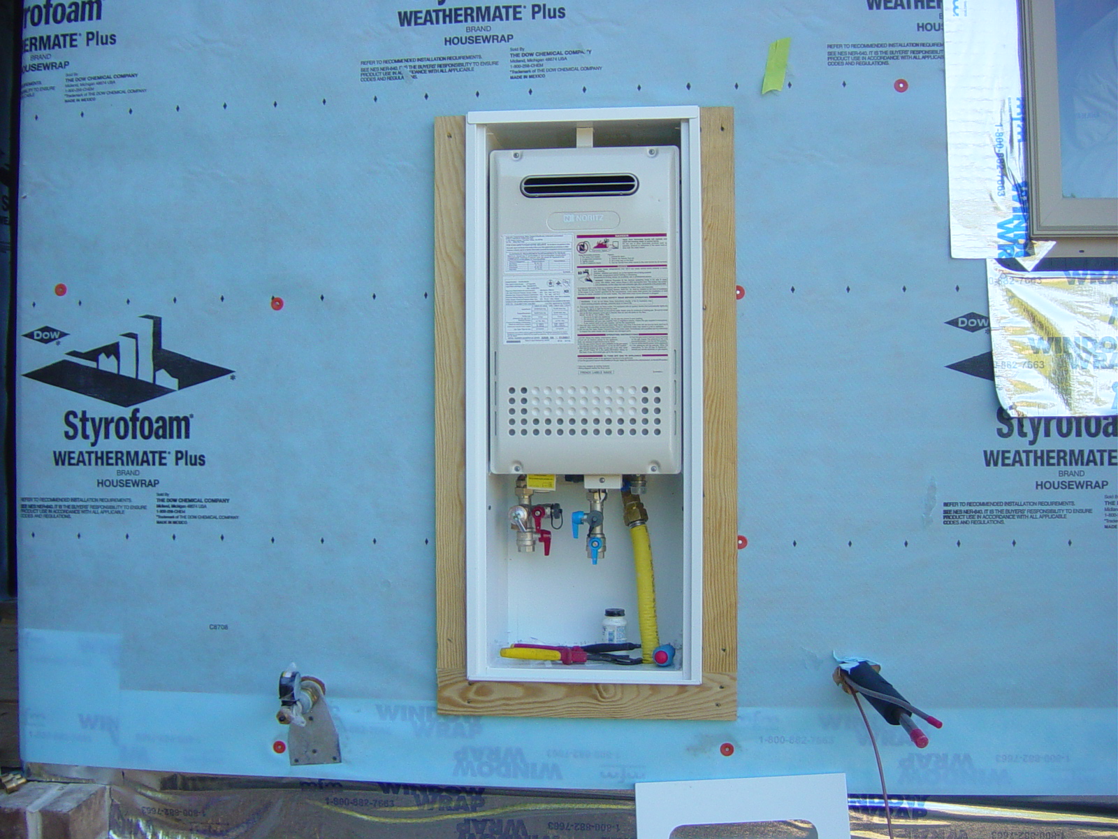 October 14, 2008 -- The plumbers are finishing up the last of their rough-in today. The water heater is in it box and will be plumbed in shortly. | ![]() |