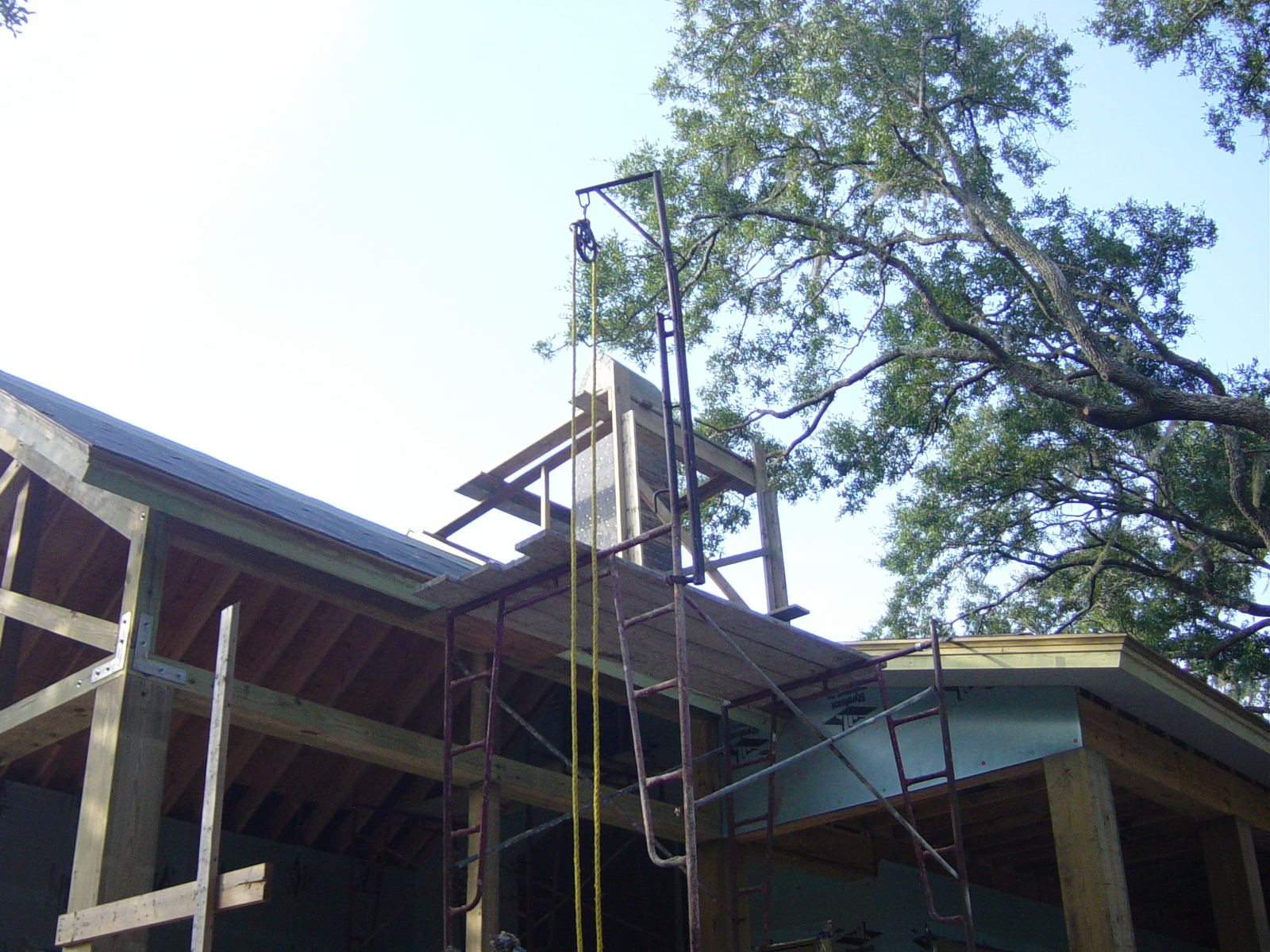 October 23, 2008 -- The scaffolding is erected around the chimney and the lathe has been installed for the stucco. | ![]() |