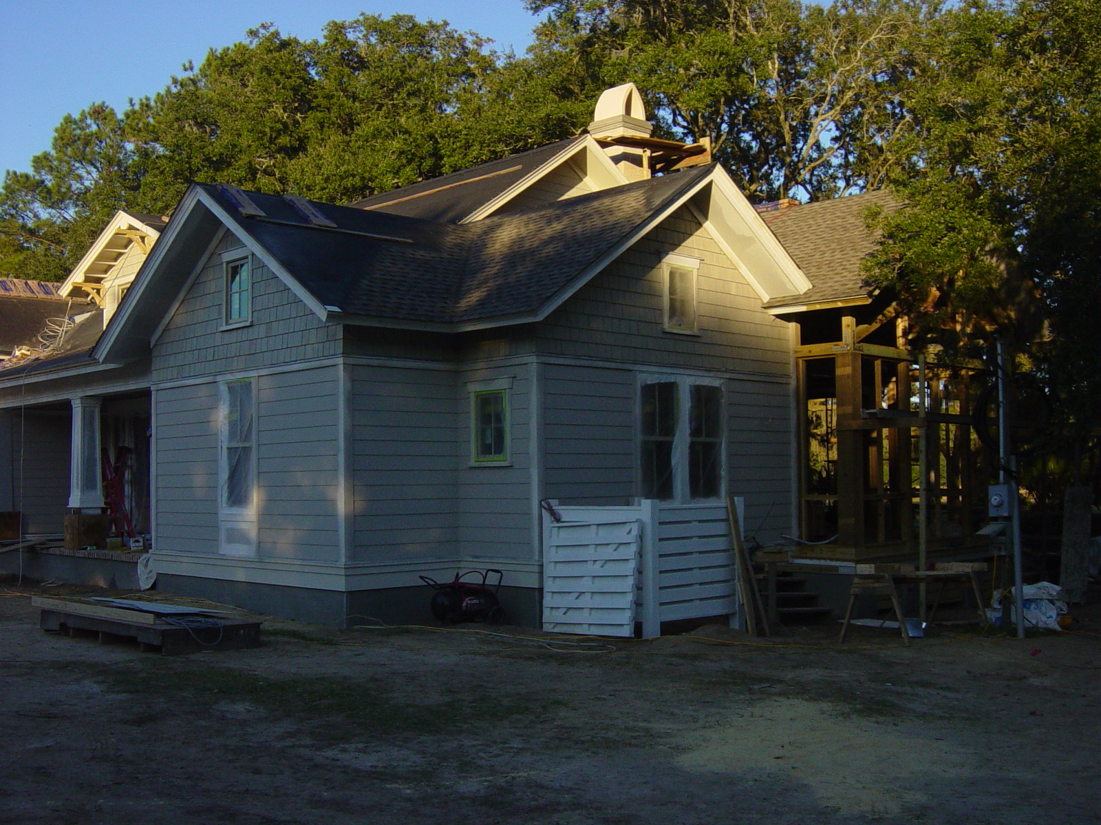 November 6, 2008 -- More shingles are on, the chimney is taking shape and the final coat is on the cedar siding. | ![]() |