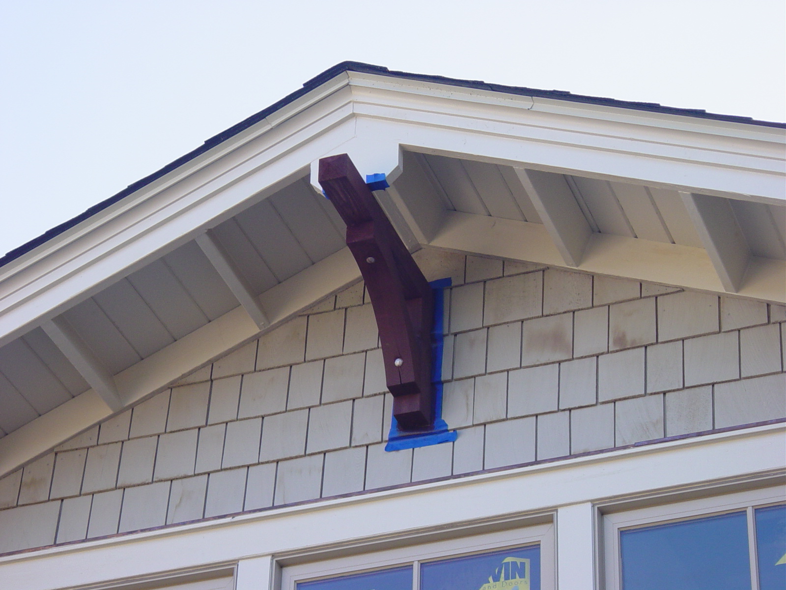 December 2, 2008 -- This is one of the gable brackets that has been stained to match the front door. It will get spar varnish on it over the stain soon. | ![]() |
