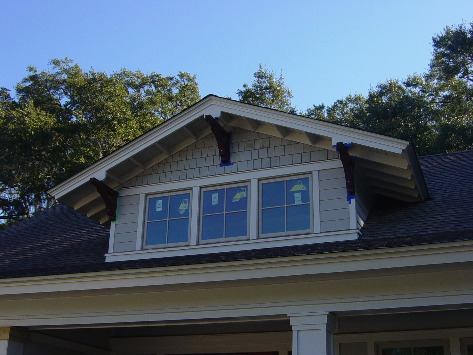 December 2, 2008 -- This is the front gable with all three brackets stained. The masking tape will stay on until they varnish the brackets. | ![]() |