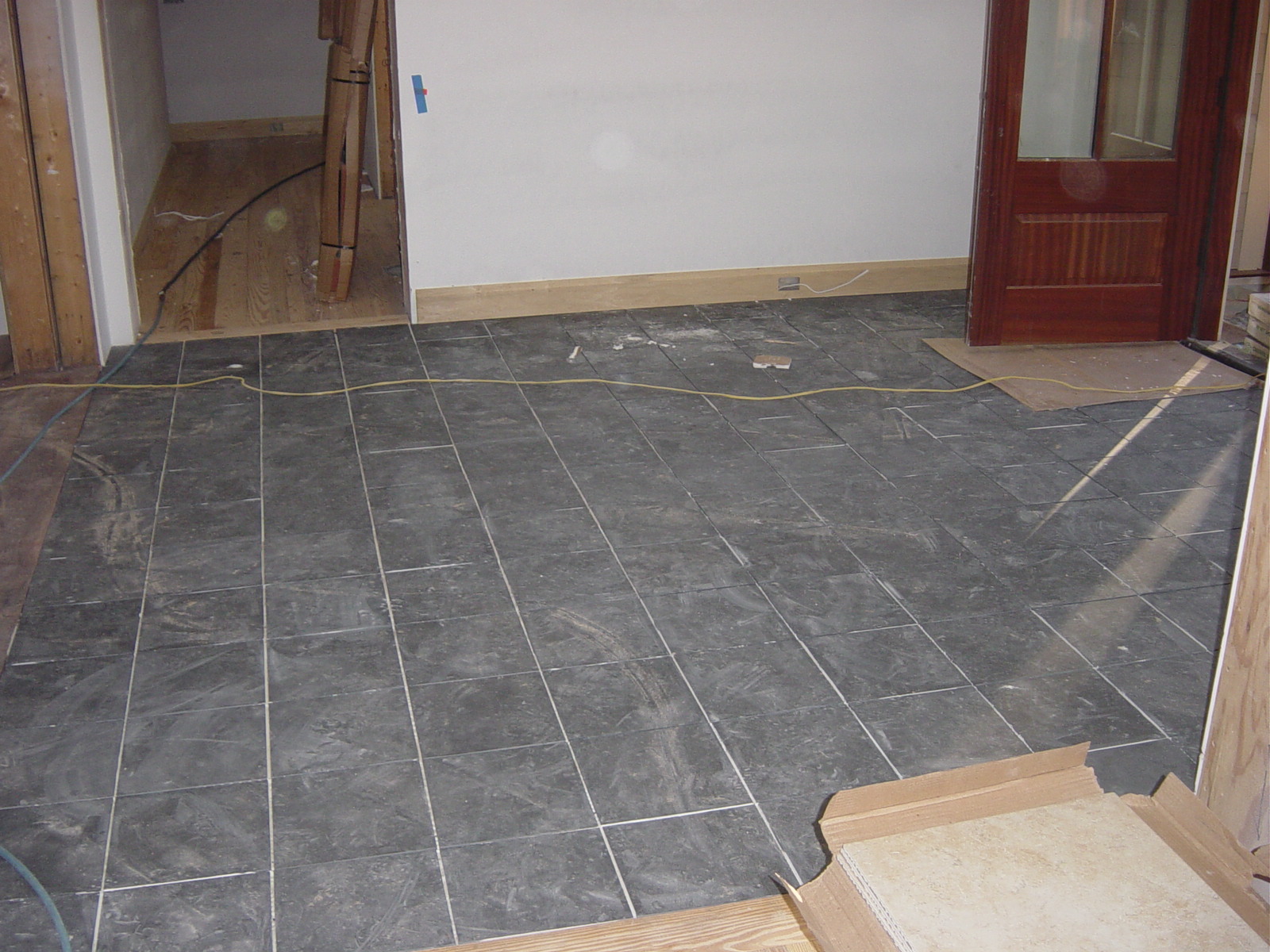 December 29, 2008 -- The slate has been laid in the foyer. It has yet to be grouted. Notice the baseboard is installed here as well. | ![]() |
