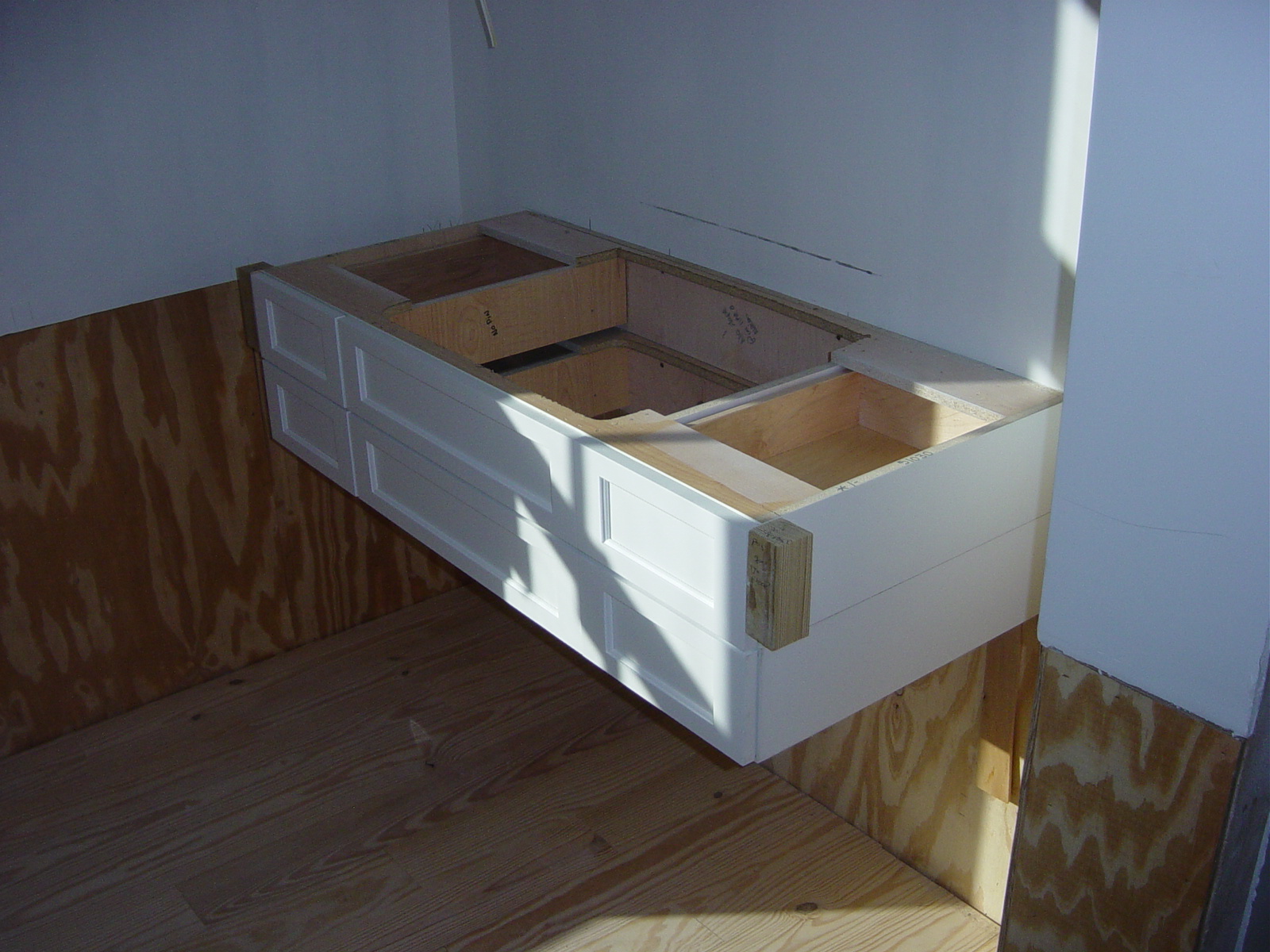 December 31, 2008 -- The cabinet in bathroom 2 is mostly installed. It will get legs and a shelf underneath after the floor is finished. | ![]() |