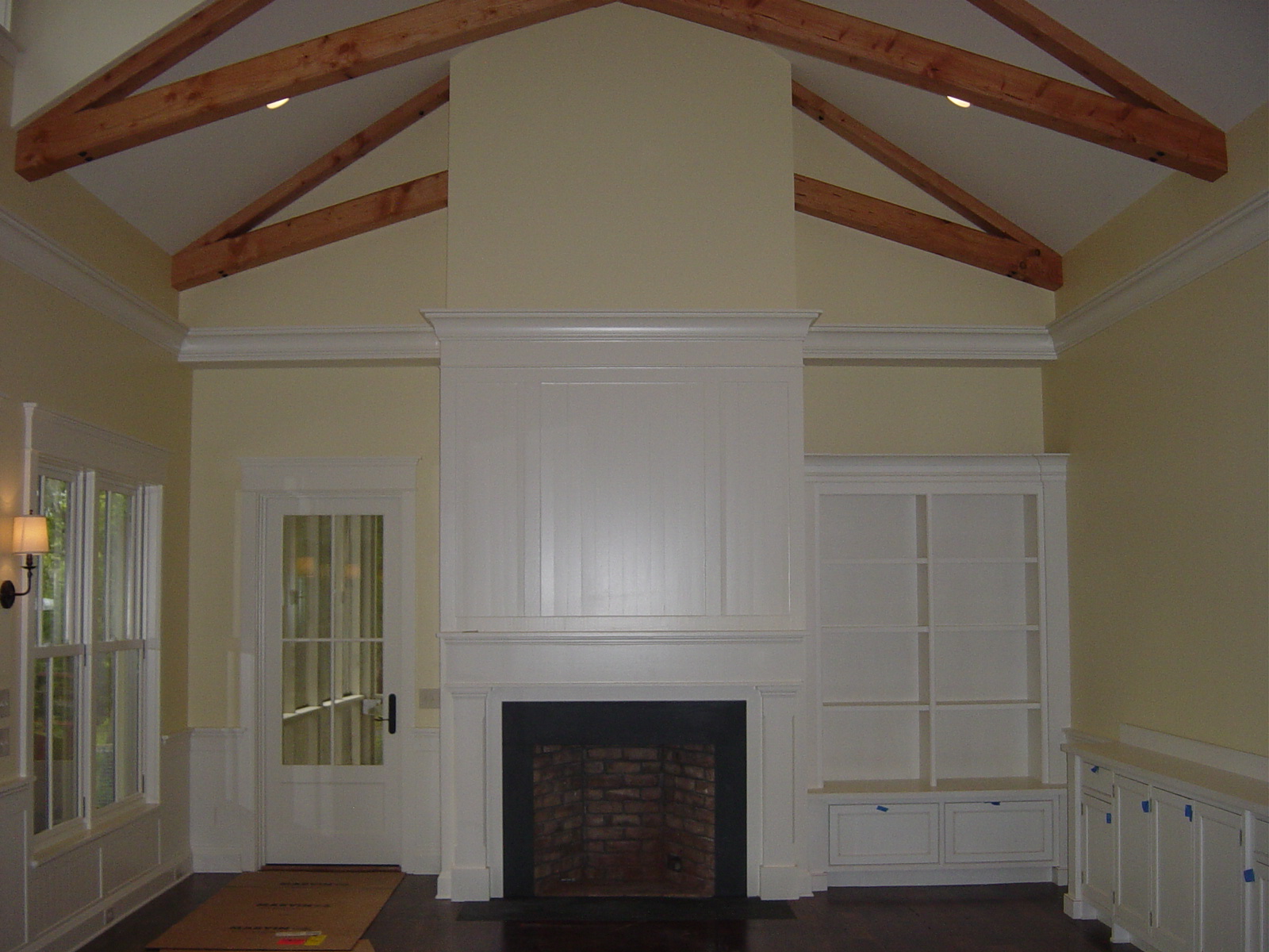 April 14, 2009 -- The great room is now complete. The hearth and fireplace surround is in and the beam trusses are finished. | ![]() |