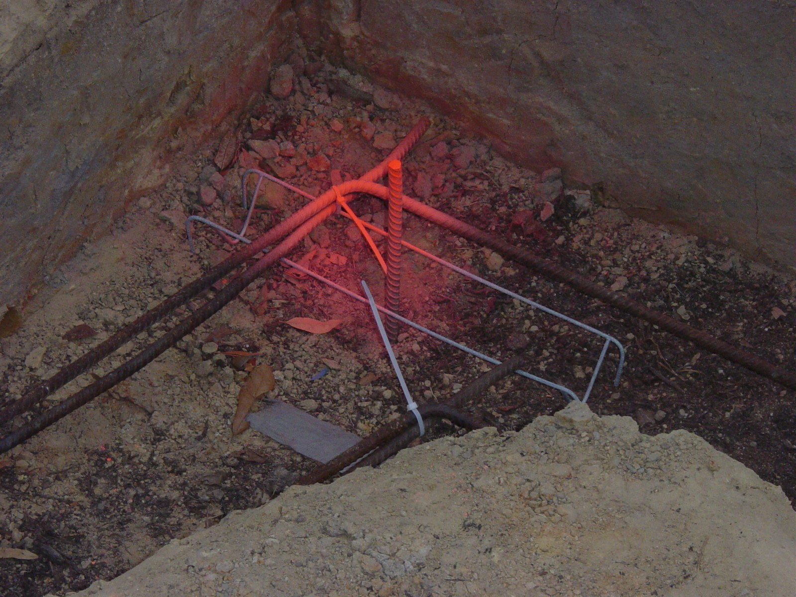 May 13, 2009 -- An up close photo showing the rebar and how it laps in the corners. The painted piece is our depth guide to show how deep to pour. | ![]() |