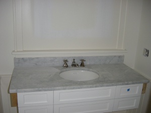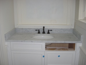 April 1, 2009 -- The vanity faucet in bath #3 was installed today. It is oil rubbed bronze in color. The missing drawer face will be installed soon.
