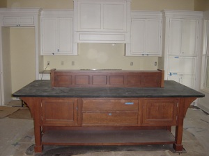 April 7, 2009 -- This is the kitchen island nearly completed. The riser on top will get another piece of trim at the top of each end pedestal.