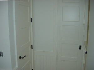 April 14, 2009 -- This is what the finished paint and door hardware look like in bath 2. The door on the right is a pocket door.