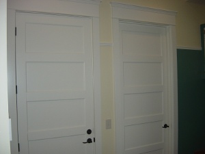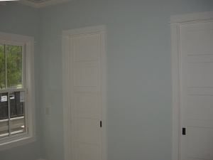 April 14, 2009 -- The two pocket doors in bedroom 3 have their hardware on now. The door on the left is the bathroom and on the right is the closet.