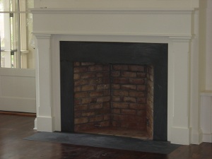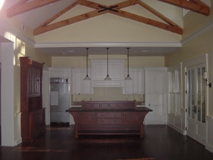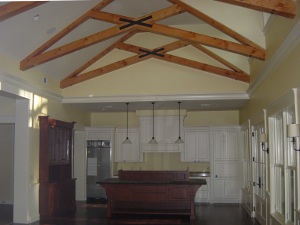 April 14, 2009 -- The great room is now complete. The hearth and fireplace surround is in and the beam trusses are finished.